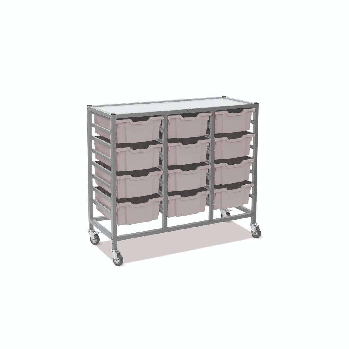 The Dynamis Triple Cart range from Gratnells is a flexible, cost-effective storage system, compatible with the award-winning Gratnells tray range. With both static frame and cart options available, The Dynamis Triple Cart range is perfect for any classroom environment. Gratnells trays are interchangeable between cart and frame options. You can easily move equipment around the school as needed. Dynamis Triple Cart Set 7 Silver (44) with 3" 2 Braked Casters & Optional Feet and 12, 6 inch deep Light Gray (19) Trays
