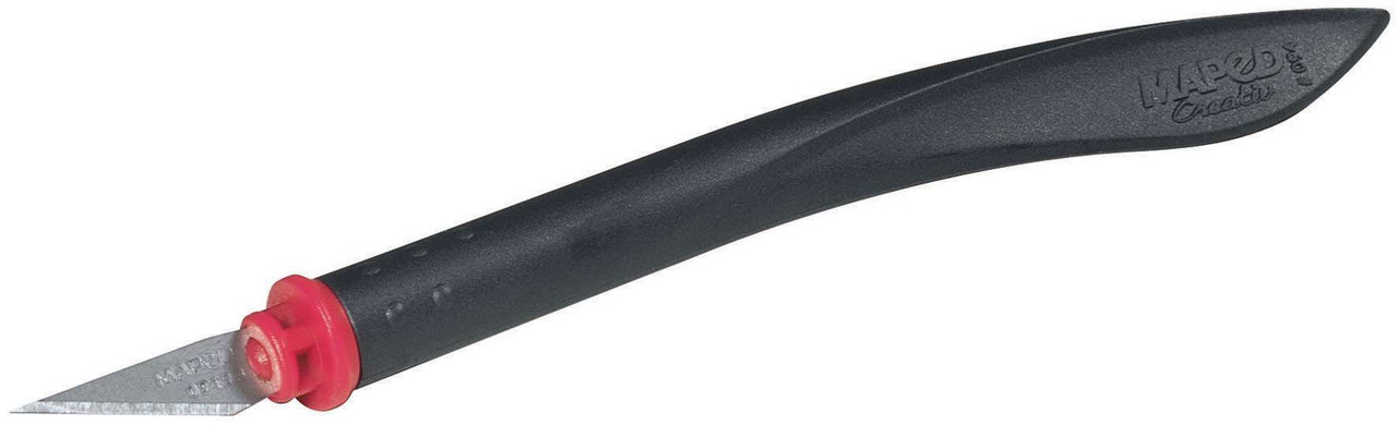 Classic knife with innovative reversible blade storage system for safety! When not in use simply remove the blade attachment from the body and store it inside the grip. The #11-style blade is secured a colorful plastic housing which is easier to hold and change than a single sharp blade. Ergonomically designed body is more comfortable to hold and will not roll. Knife body comes with 3 replacement blades.