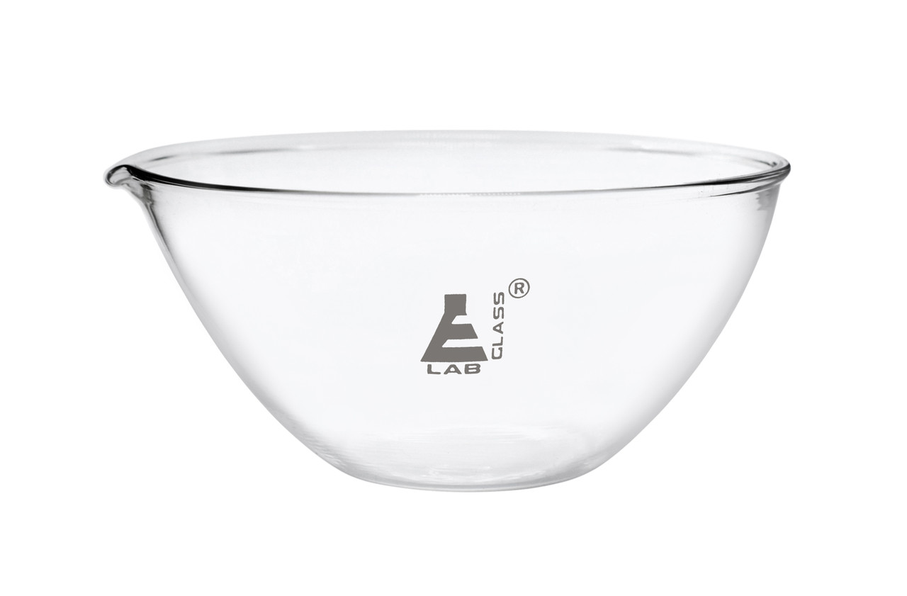 1000ml capacity evaporating basin made of high-quality, heavy-duty Borosilicate 3.3 glass. Basin features a flat bottom and a spout for easy pouring. Designed for evaporating excess solvents in the laboratory but is an excellent addition to any kitchen for measuring, mixing, or storing ingredients.