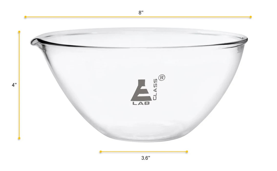 2000ml capacity evaporating basin made of high-quality, heavy-duty Borosilicate 3.3 glass. Basin features a flat bottom and a spout for easy pouring. Designed for evaporating excess solvents in the laboratory but is an excellent addition to any kitchen for measuring, mixing, or storing ingredients.
