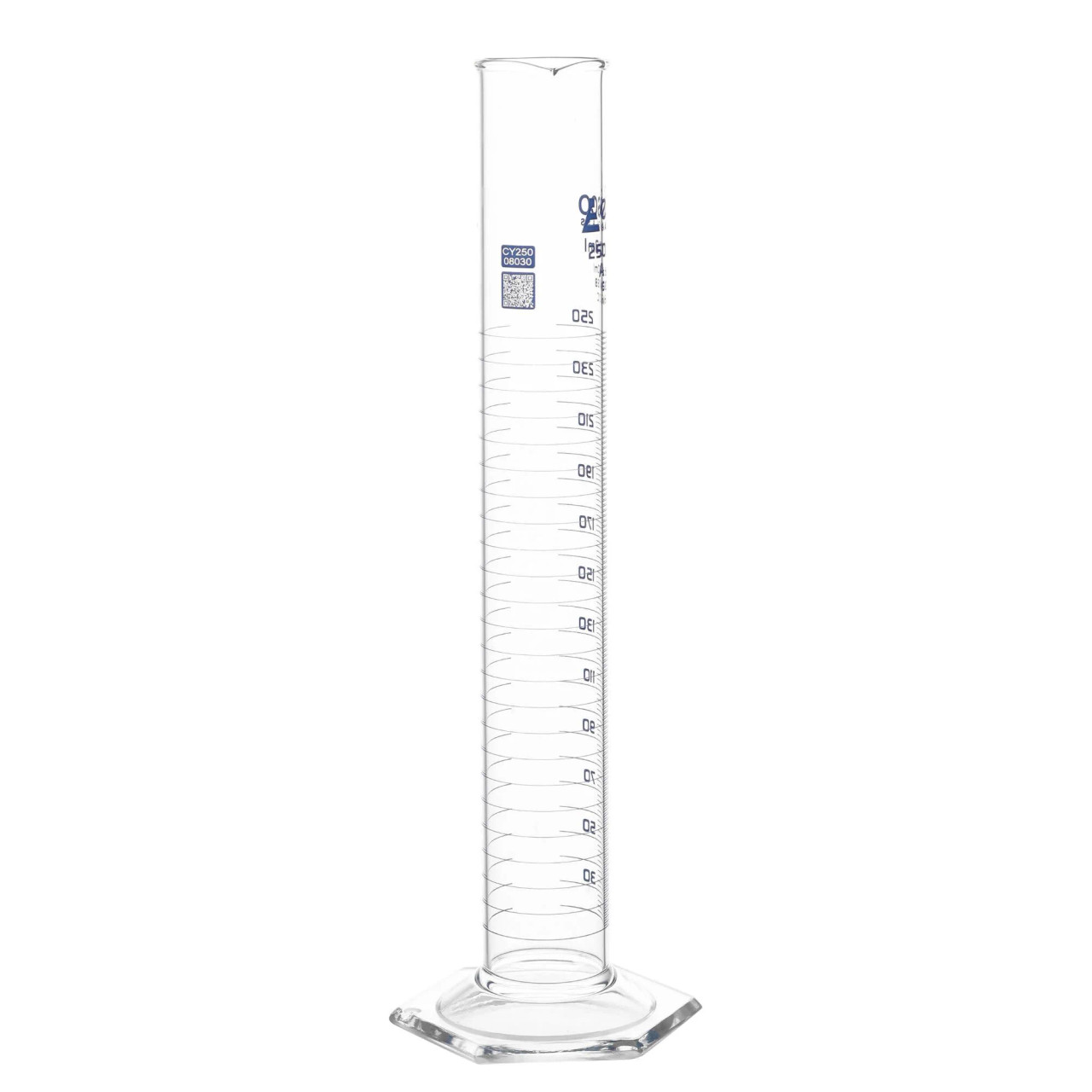250mL capacity measuring cylinder made of high quality, heavy duty borosilicate 3.3 glass. Hexagonal base for extra stability. Class A tolerance ±1.00mL.