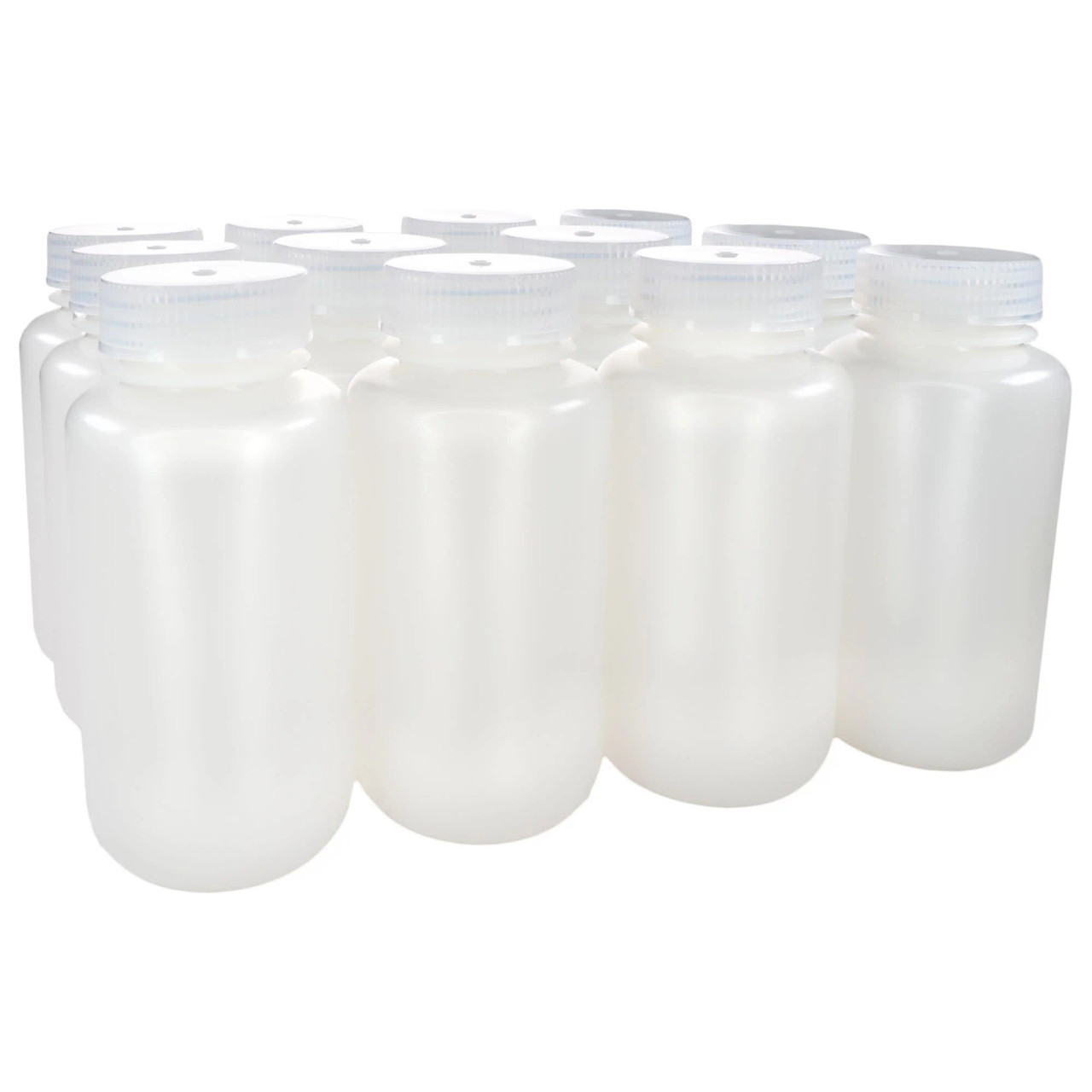 - PACK OF 12 HDPE REAGENT BOTTLES || Includes twelve 250mL translucent wide-mouth bottles made of HDPE, featuring polypropylene caps, ideal for reagent storage and lab use.