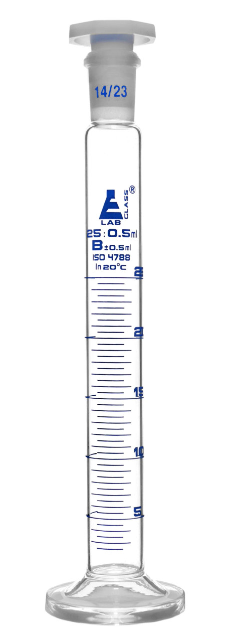 Measuring Cylinder, fitted with an interchangeable 14/23 polypropylene stopper. Class B. Made of high quality borosilicate glass. 25ml capacity, 1ml graduation lines, marked every 5ml. Blue graduations. Stands 7.5" tall, and has a base measuring 1.9". Cylinder body measures 0.8" in diameter.