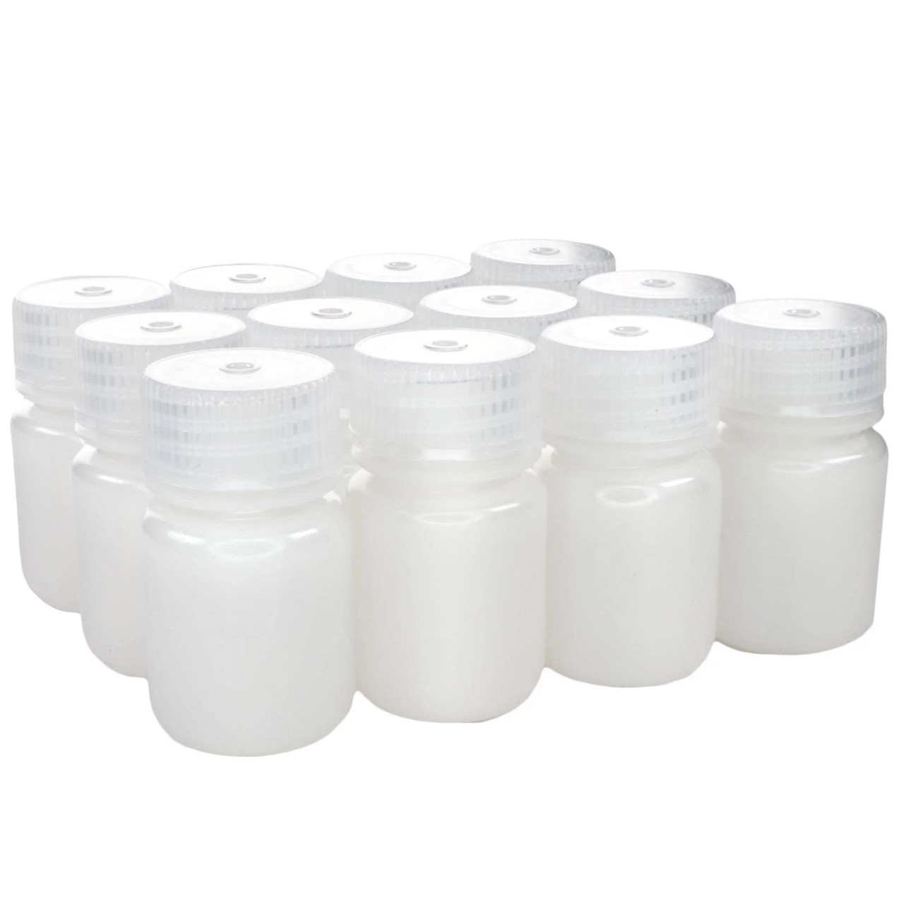 - PACK OF 12 HDPE REAGENT BOTTLES || Includes twelve 30mL translucent wide-mouth bottles made of HDPE, featuring polypropylene caps, ideal for reagent storage and lab use.
