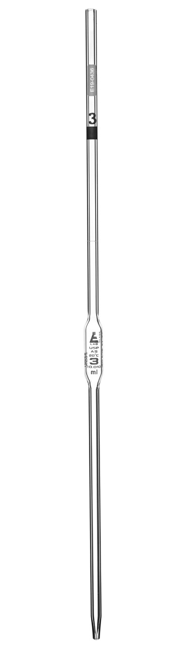 Bulb pipette made of high quality, heavy duty Borosilicate 3.3 glass. 3ml capacity. Class AS, tolerance, ±0.100ml. Calibrated to deliver. Includes individual work certificate. Pipette measures 14.25" in length, and has a body diameter of 0.25". Bulb diameter measures 0.4". Top has an inner diameter of 3mm and an outer diameter of 6mm. Autoclavable, with superior chemical durability. Low temperature gradient- can withstand high temperatures & thermal shocks. Eisco Labs Borosilicate glass has the following heat tolerances: Strain Point -515°C | Annealing Point 565°C | Softening Point 820°C. Eisco Labs proudly manufactures its own products using state-of-the-art equipment, and following the highest standards of quality control. Each product is carefully designed by a team of laboratory professionals and experienced engineers with quality and durability in mind. They are manufactured with only the highest grade, raw materials and according to international quality standards to ensure that they can withstand use in even the toughest laboratory environments.