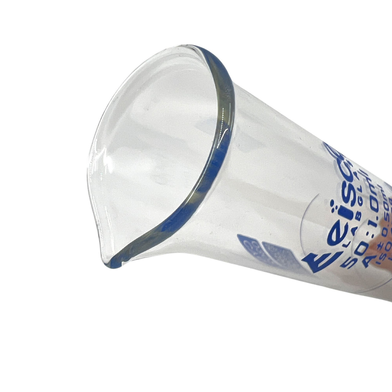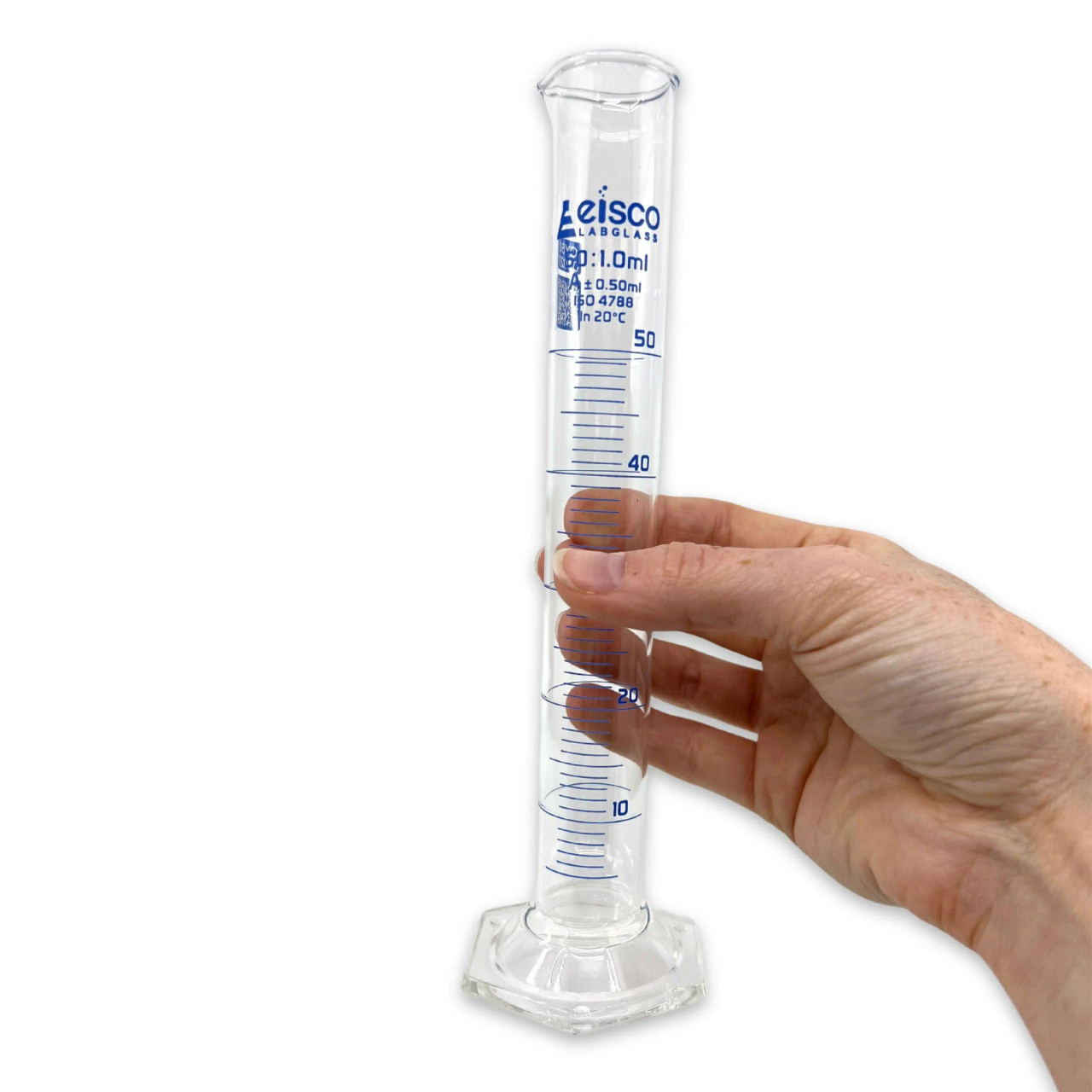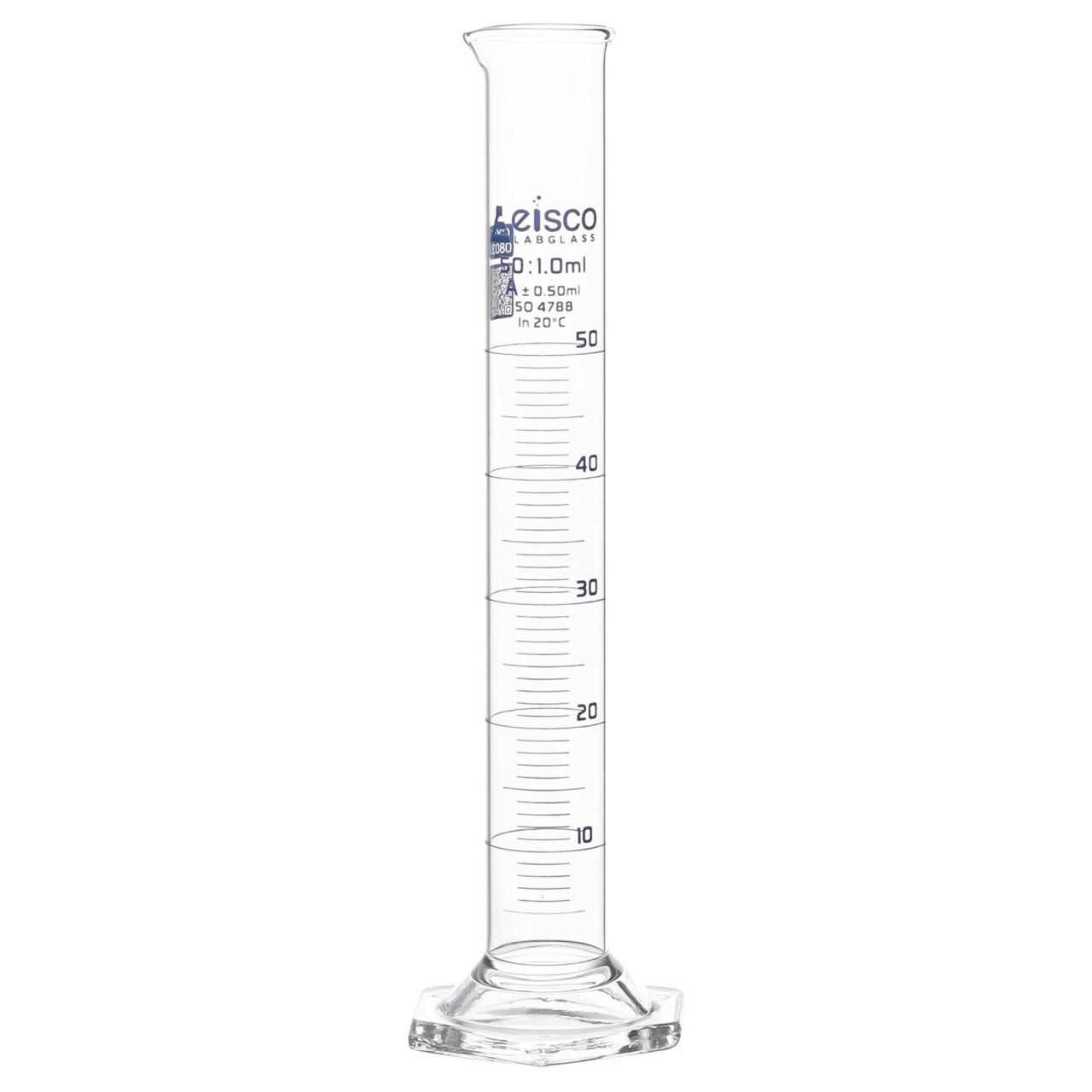 50mL capacity measuring cylinder made of high quality, heavy duty borosilicate 3.3 glass. Hexagonal base for extra stability. Class A tolerance ±0.50mL.