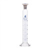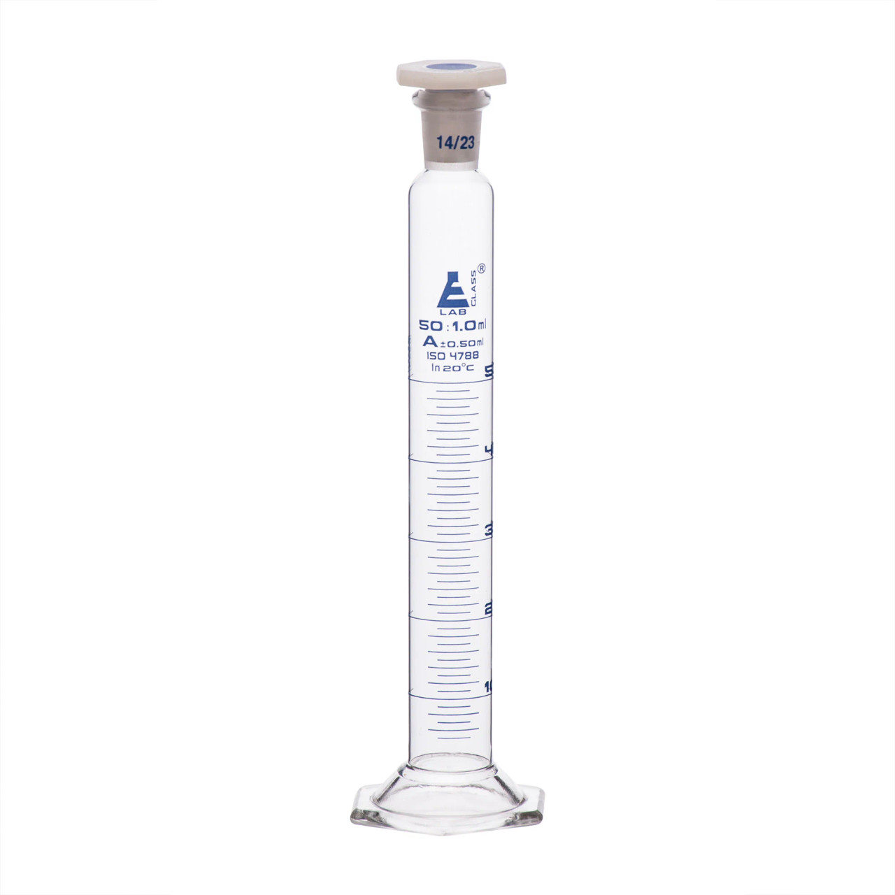 50ml capacity measuring cylinder made of high quality, heavy duty Borosilicate 3.3 glass. Hexagonal base for extra stability. Blue 1.0ml graduations. Class A tolerance, ±0.5ml as per ISO/ASTM. Fitted with a 14/23 polypropylene stopper.