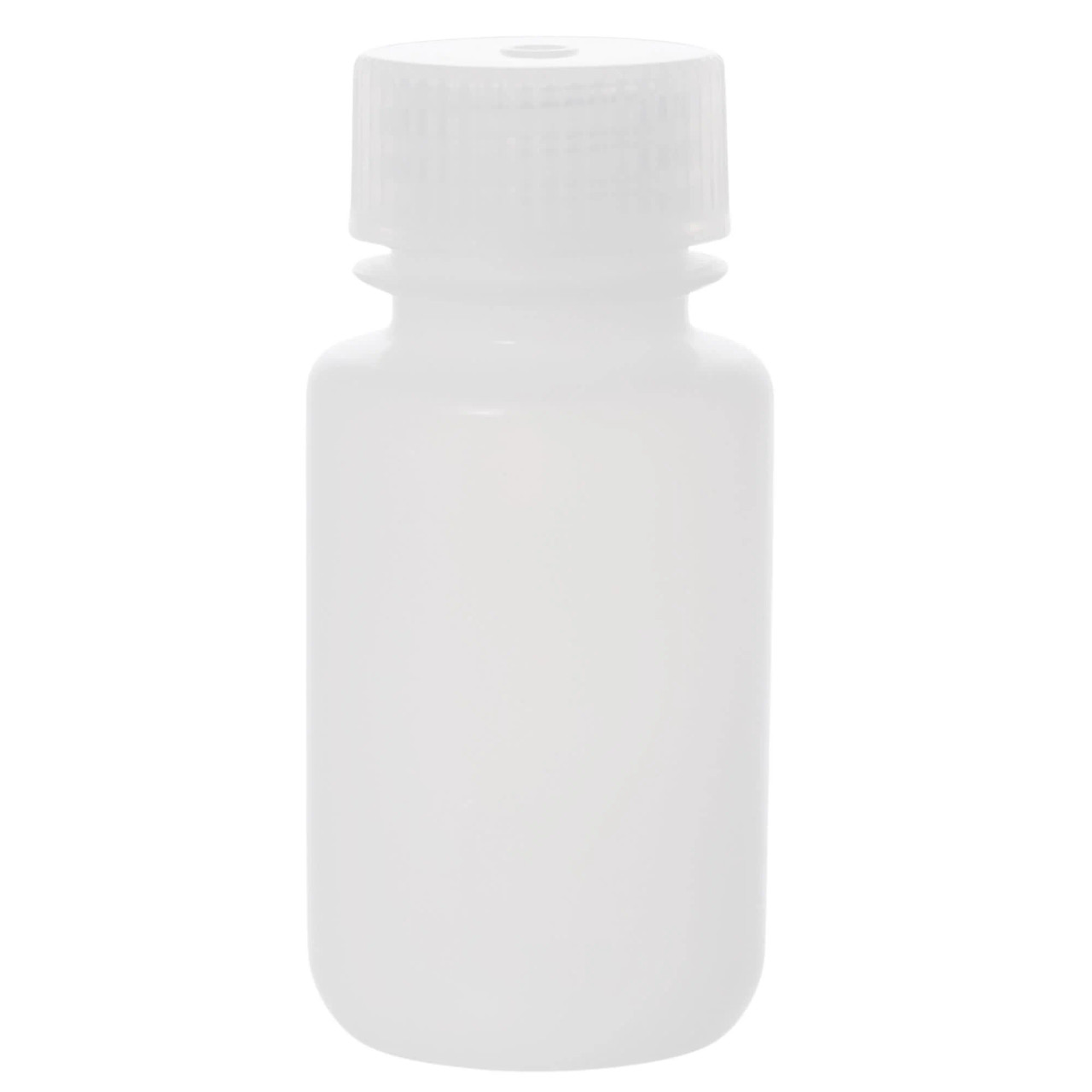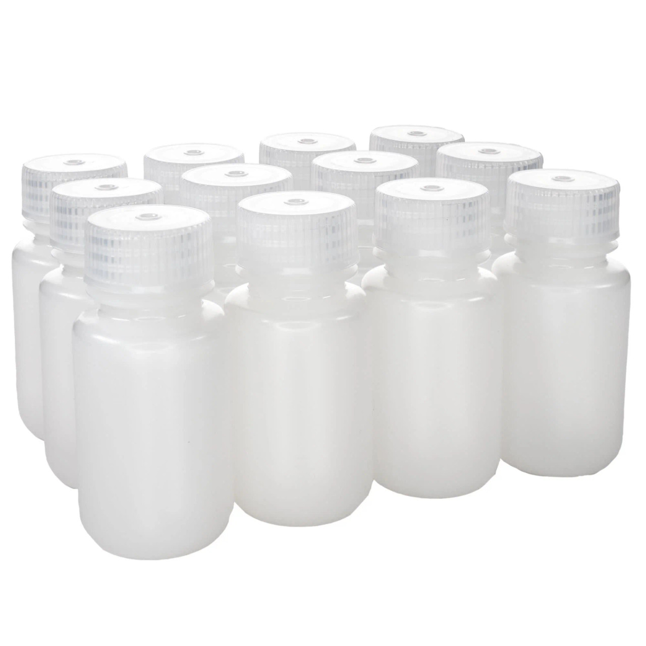 60mL wide mouth HDPE reagent bottles with polypropylene caps, available in a pack of 12. Designed for safe storage, transportation, and handling of laboratory reagents and solutions. Temperature range -100°C to 120°C, with a wide mouth for easy pouring and filling.