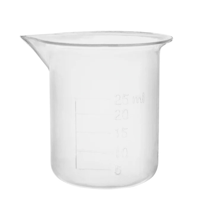 25mL beaker made of premium quality, translucent polypropylene plastic. Features 5mL raised graduations and specifications. The beaker has a tapered spout for easy pouring.
