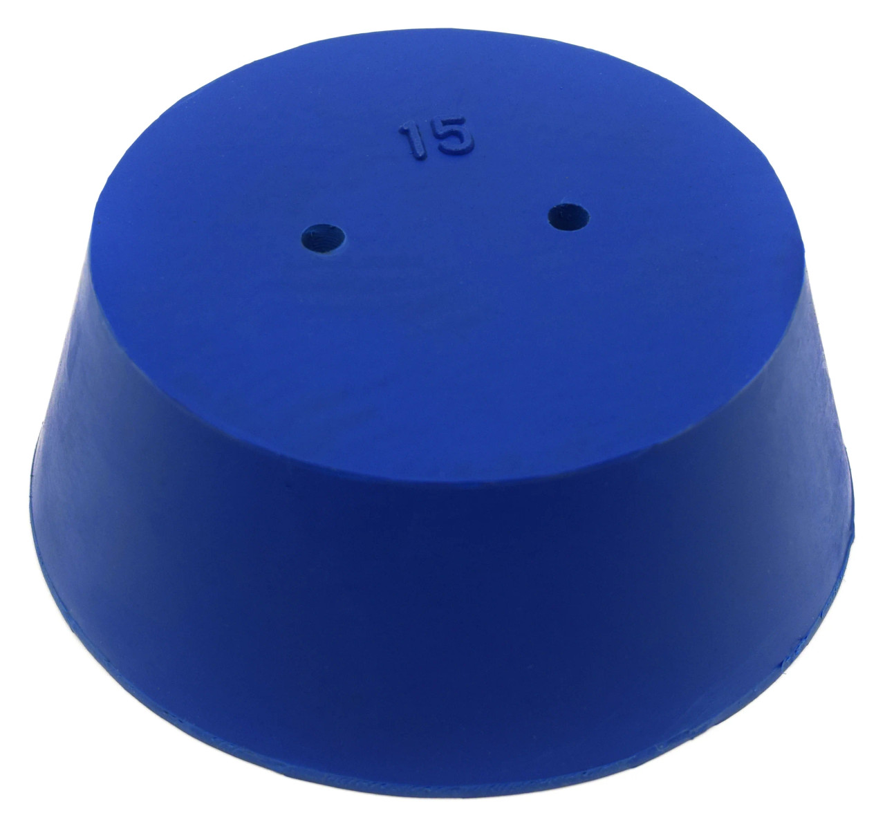 Pack of ten #15 stoppers made of long lasting neoprene rubber. Blue color. Each stopper features two holes measuring 5mm in diameter. Manufactured according to sizes recommended by ASTM standards. Each stopper measures 39mm in length, has a base diameter measuring 83mm, and a top diameter measuring 103mm. The neoprene rubber construction is suitable for use with petroleum products, minerals, oils and fats, as well as most inorganic acids and bases. Resistant to temperatures ranging from -40 to 130°C. Eisco Labs proudly manufactures its own products using state-of-the-art equipment, and following the highest standards of quality control. Each product is carefully designed by a team of laboratory professionals and experienced engineers with quality and durability in mind.