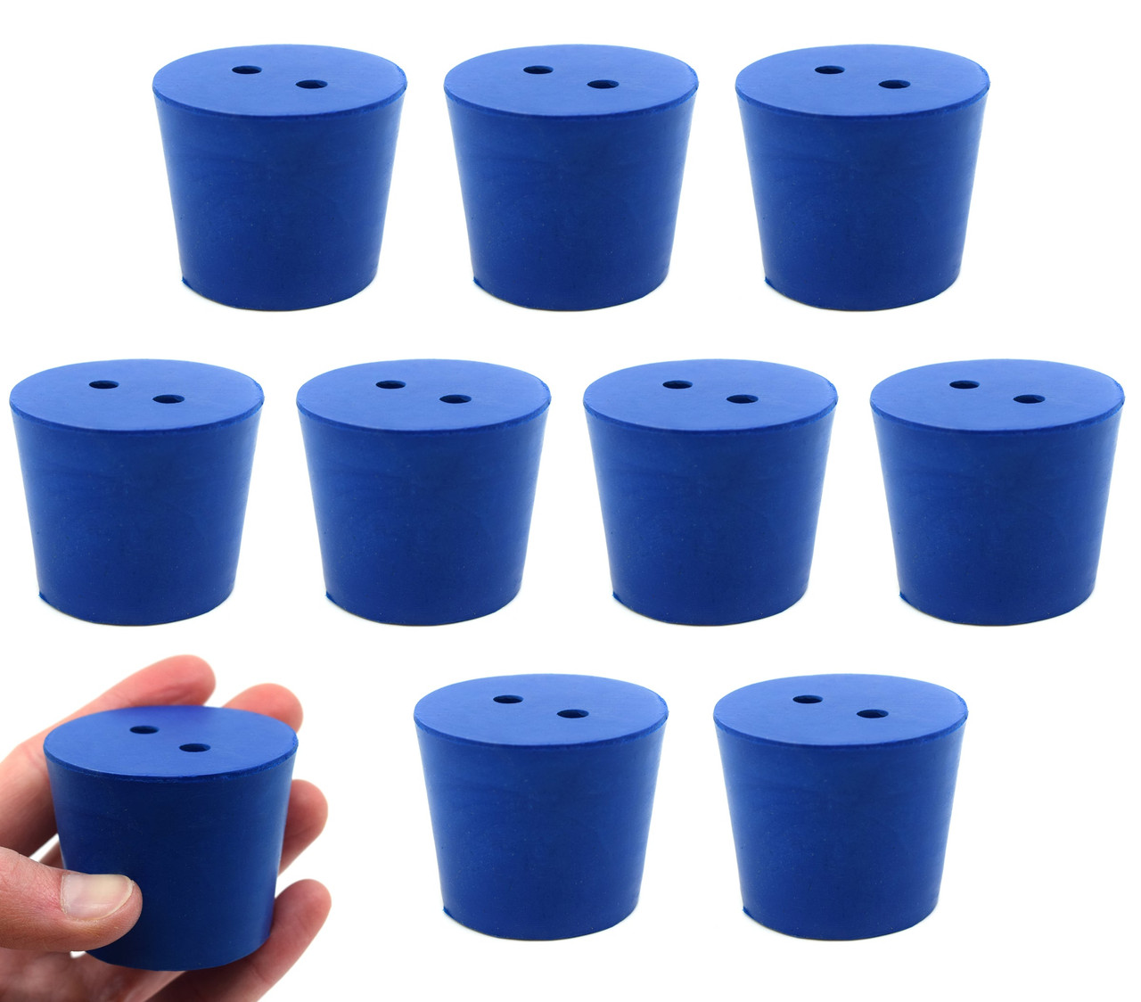 Pack of 10 stoppers made of neoprene rubber. Each stopper has 2 holes measuring 5mm in diameter. Blue color. Each stopper measures 40mm in length, has a base diameter measuring 40mm, and a top diameter measuring 49mm. The neoprene rubber construction is suitable for use with petroleum products, minerals, oils and fats, as well as most inorganic acids and bases. Resistant to temperatures ranging from -40 to 130°C. Eisco Labs proudly manufactures its own products using state-of-the-art equipment, and following the highest standards of quality control. Each product is carefully designed by a team of laboratory professionals and experienced engineers with quality and durability in mind.