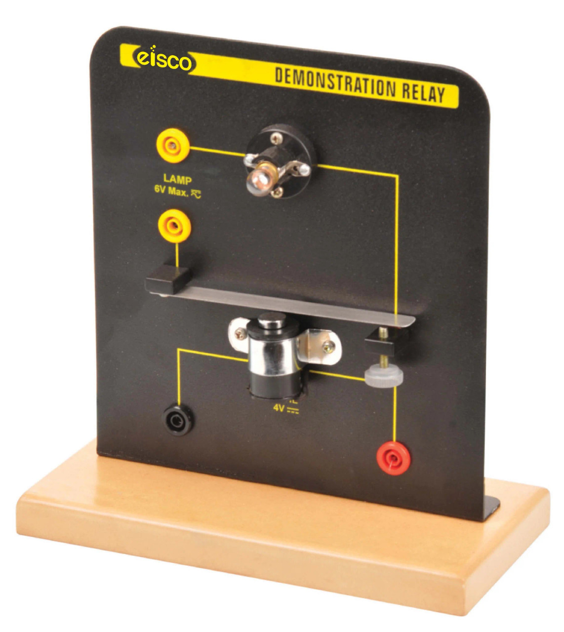 The Relay Demonstration Unit allows the investigation and study of how a relay functions, in a clear and practical manner. A useful property of this unit is that the circuit powering the coil is easily seen to be completely separate from the circuit switched on by the relay. This is one of the reasons relays are used where a safe low voltage circuit can be used to control a high voltage circuit. Coil Input 4-6V DC Bulb Input Max. 6V AC / DC