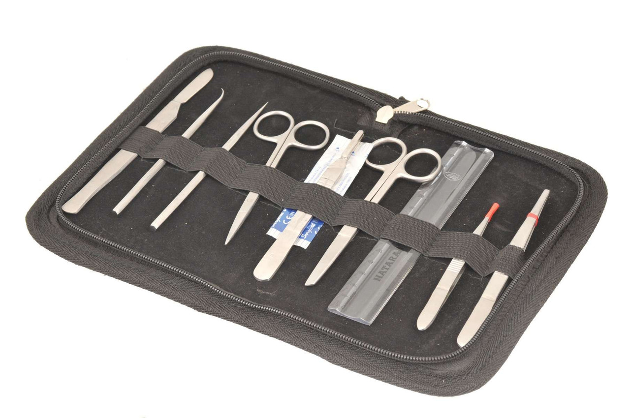 9 piece, stainless steel dissection set comes in a premium leather storage case and contains the necessary instruments for accurate dissection.