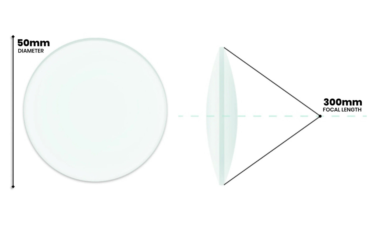 High quality, optically true lens. Made of highly polished, quality glass. Spherical with ground edges. Designed for educational purpose and science classroom demonstrations in optics and light physics. Lens measures 2" (50mm) in diameter and is approximately 2.8mm thick. Converging focal length of 300mm.