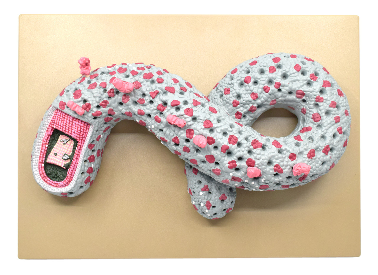 This 3D model represents the virus magnified approximately 100,000 times in its unique shape. The surface of the model shows the viral membrane with Glycoproteins. A cut- away at one end exposes internal structures, major and minor matrix proteins, polymerase protein, and Ebola RNA.
