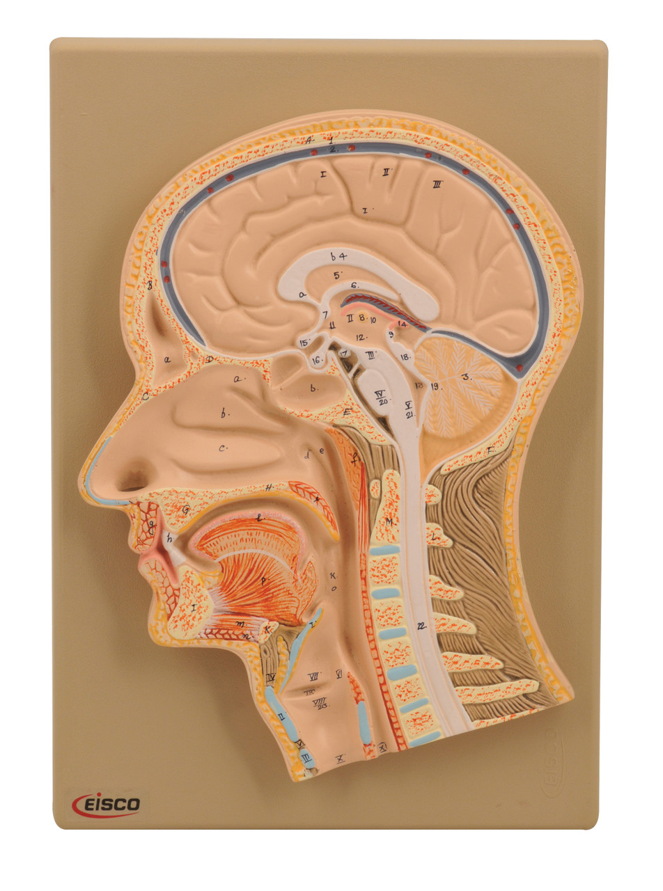 - Shows the median section of human head, brain, nose, mouth, and pharynx, larynx and vertebral column of the neck.