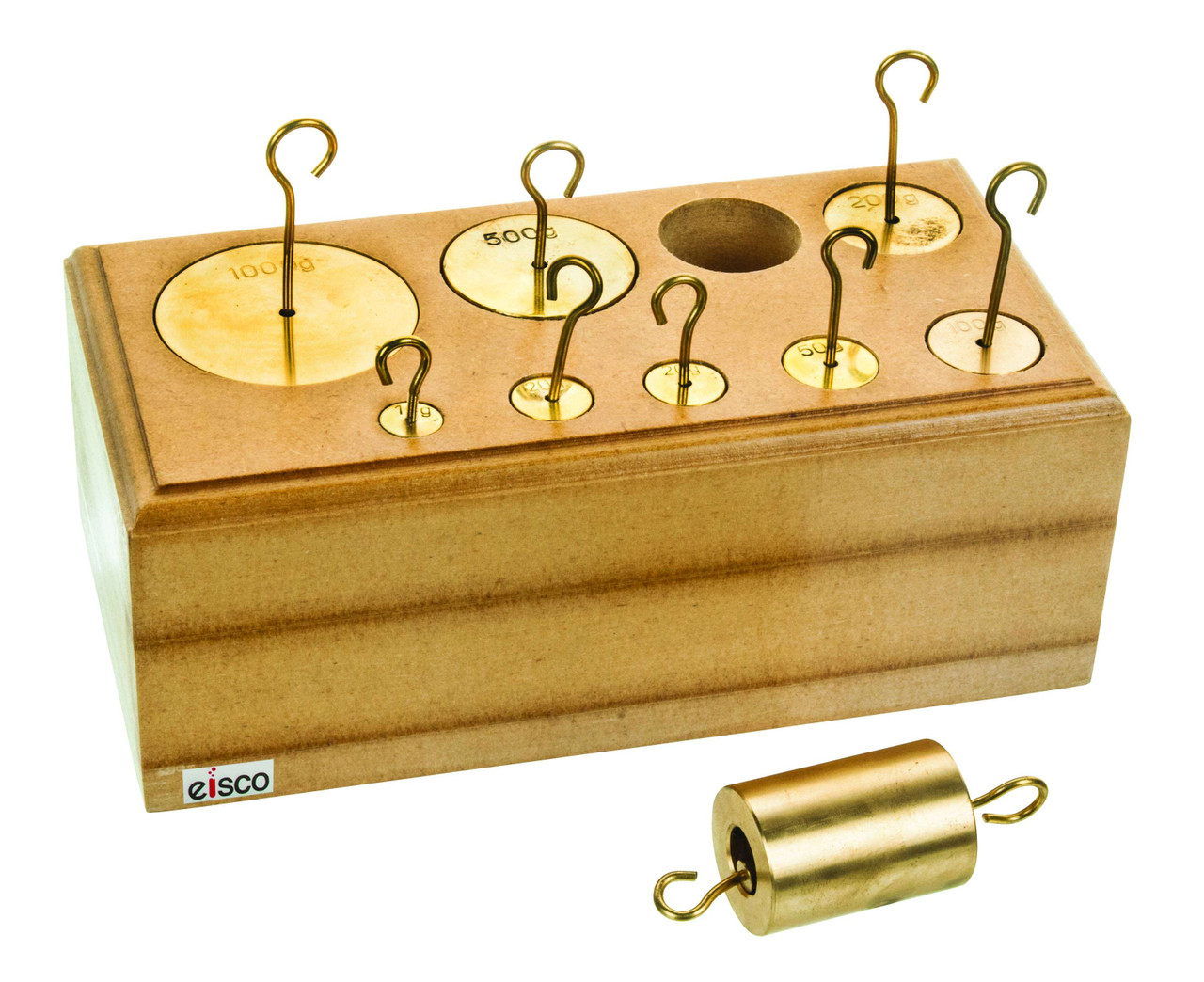 A classic tool used in any lab or classroom. This 9-piece brass weight set with a wooden block holder will last for decades of use due to its high integrity instruction and quality brass material. The set includes 1000g, 500g, (2) 200g, 100g, 50g, (2) 20g, and 10g weights.