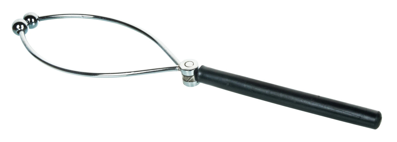 Jointed, small plated brass sphere mounted on curved arms, with ebonite insulating handle. Length 20 cm.