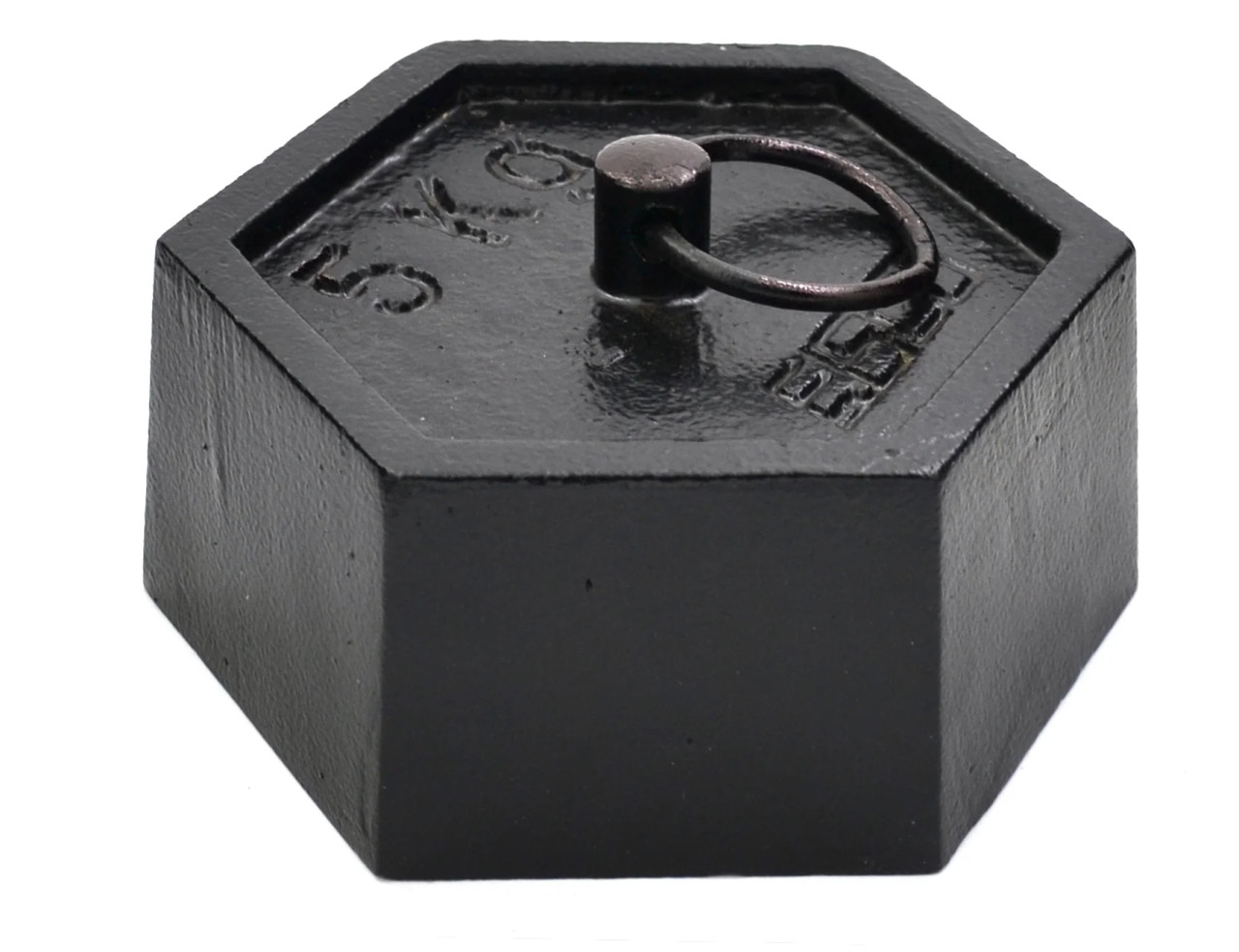 Eisco's 5000g (11lb) Hexagonal Iron Masses are ideal for balancing scale applications in the classroom. The lifting ring makes for safer and easier transporting and allows for activities that require hanging.