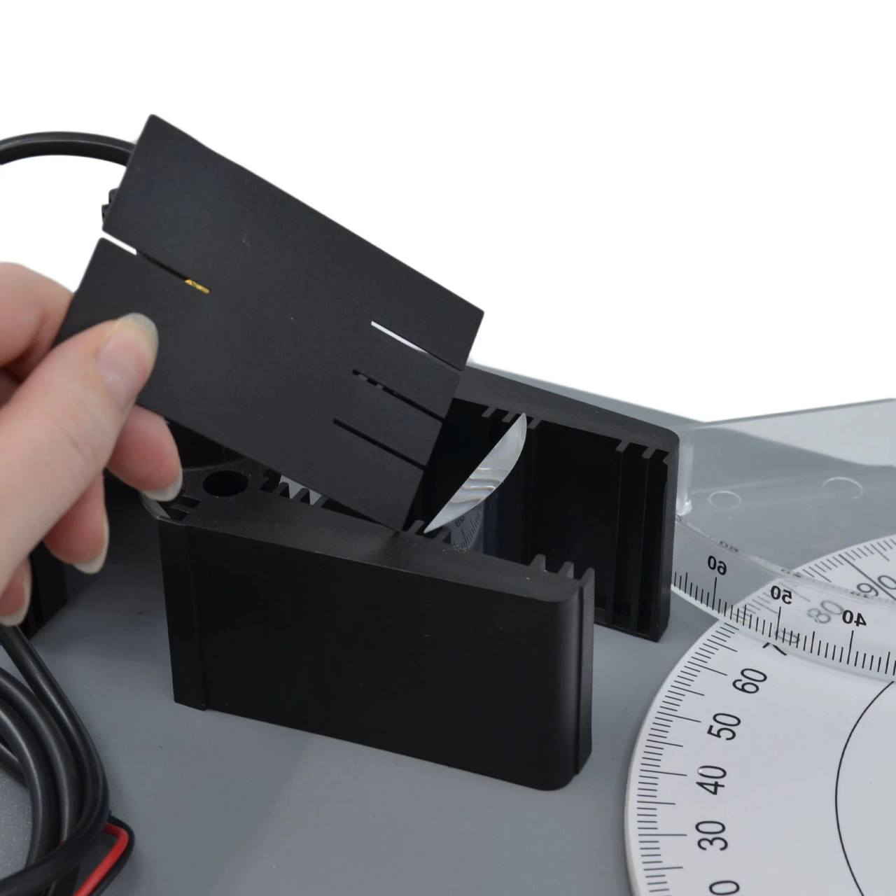 The mounted light source works with single, double, triple, and wide slit attachments to experiment with beam behavior. The included acrylic semi-circle chamber allows the use of various mediums for measuring refraction and critical angles. Perfect for classrooms, this set includes all essential components for conducting detailed optics experiments. *Requires a 12V DC power supply for the light source (not included).*