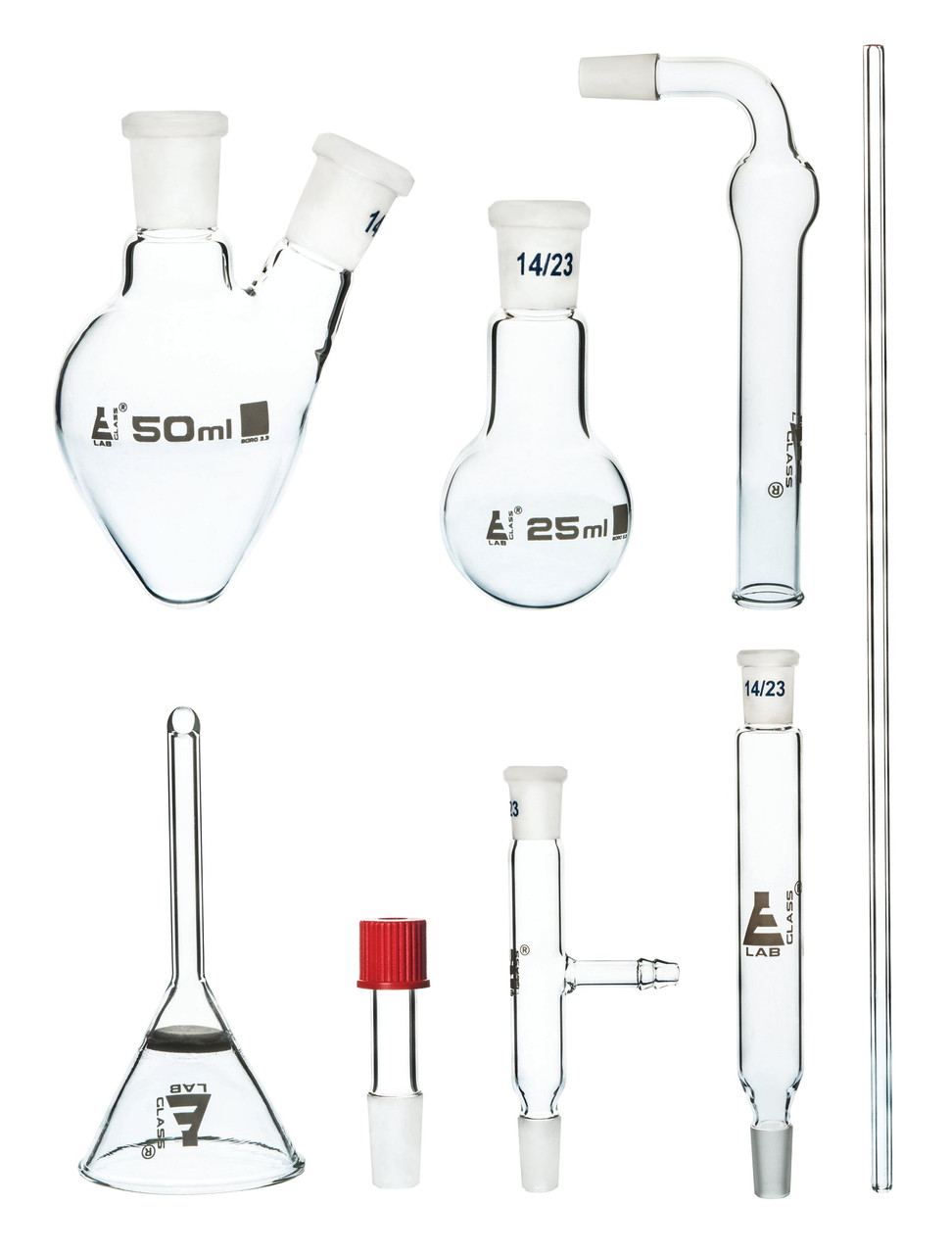 This set contains 9 items with 14/23 ground joints for maximum versatility. Glassware pieces are made of high quality borosilicate glass. Over 20 standard assemblies can be constructed from simple reflux to fractional distillation. Stored in die cut foam lined box. This extension kit contains 8 items required to convert 27BU/M to 23BU/M. Kit consists of: 1 Round Bottom Flask (25 ml), 1 Air Condenser, 1 Sintered Glass Funnel, 1 Drying Tube, 1 Pear Shaped Flask (50 ml, 2 neck), 1 Steam Inlet Tube, 1 Adaptor with T-Connector, 1 Screwcap Adaptor. Autoclavable, with superior chemical durability. Low temperature gradient- can withstand high temperatures & thermal shocks. Eisco Labs Borosilicate glass has the following heat tolerances: Strain Point -515°C | Annealing Point 565°C | Softening Point 820°C. Eisco Labs proudly manufactures its own products using state-of-the-art equipment, and following the highest standards of quality control.
