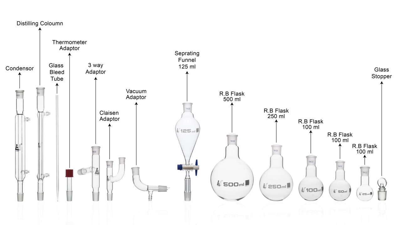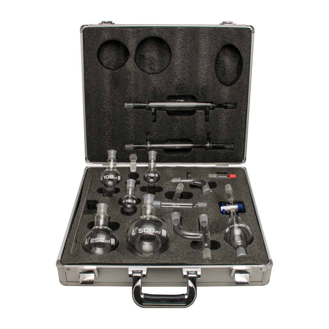Kit includes: 2 Lieber Condensers, Glass Stirring Rod, Cone/Screwcap Adapter, 2 Multiple Adaptors, Receiver Adaptor with Vacuum Connection, Dropping Funnel with Stopcock, 500ml Flask (round bottom), 250ml Flask (round bottom), 100ml Flask (round bottom), 50ml Flask (round bottom), 25ml Flask (round bottom), 2 Glass Stoppers.