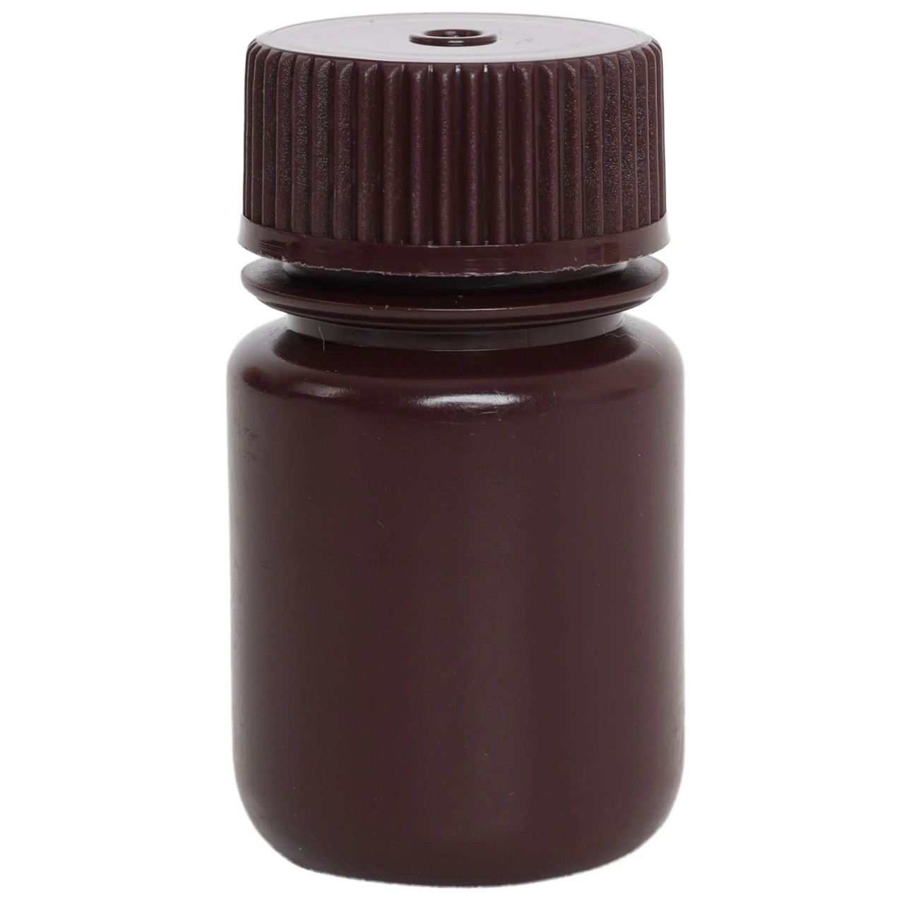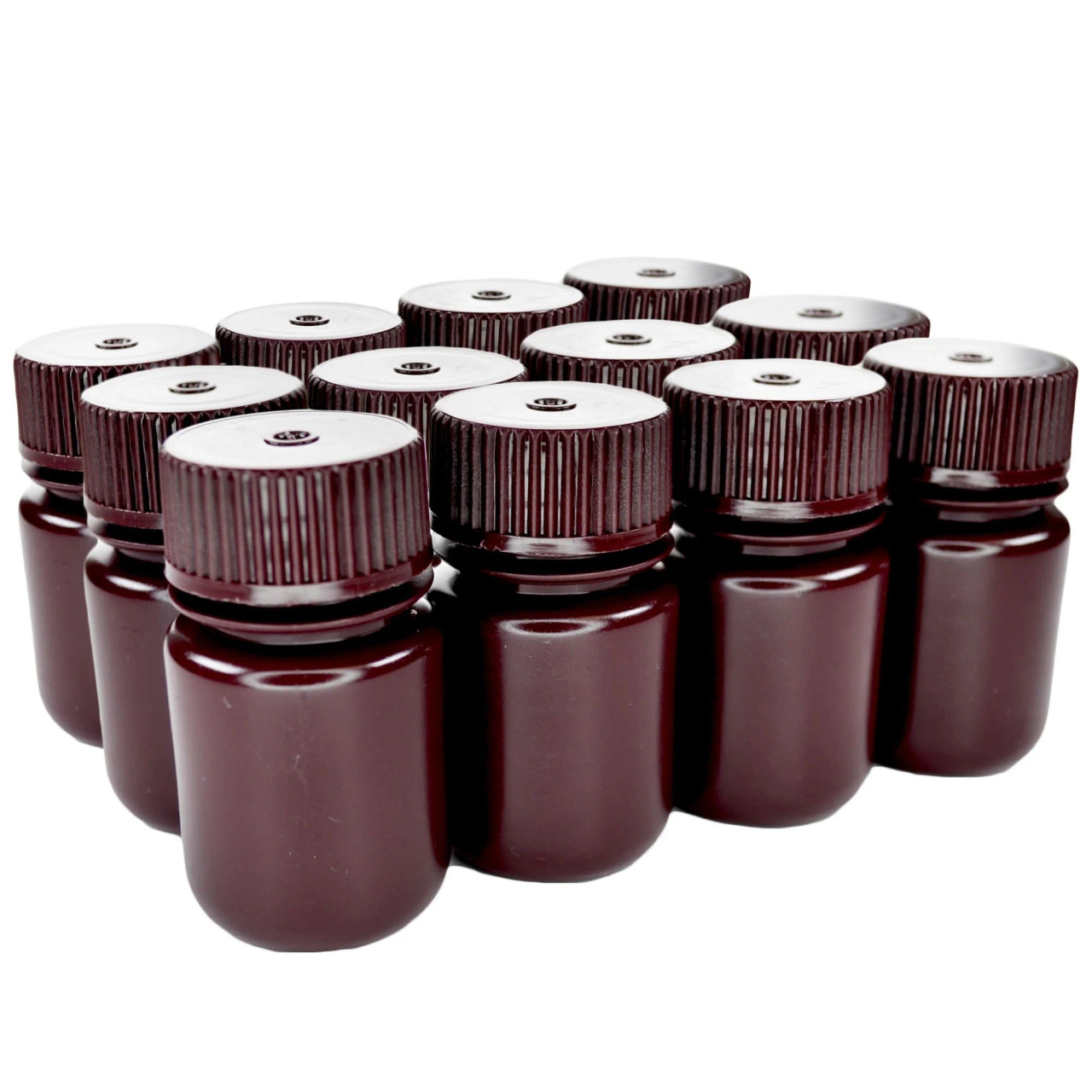 - PACK OF 12 REAGENT BOTTLES || Includes 12 30mL wide-mouth amber HDPE bottles with polypropylene caps, designed for lab storage and secure transport of light-sensitive samples.