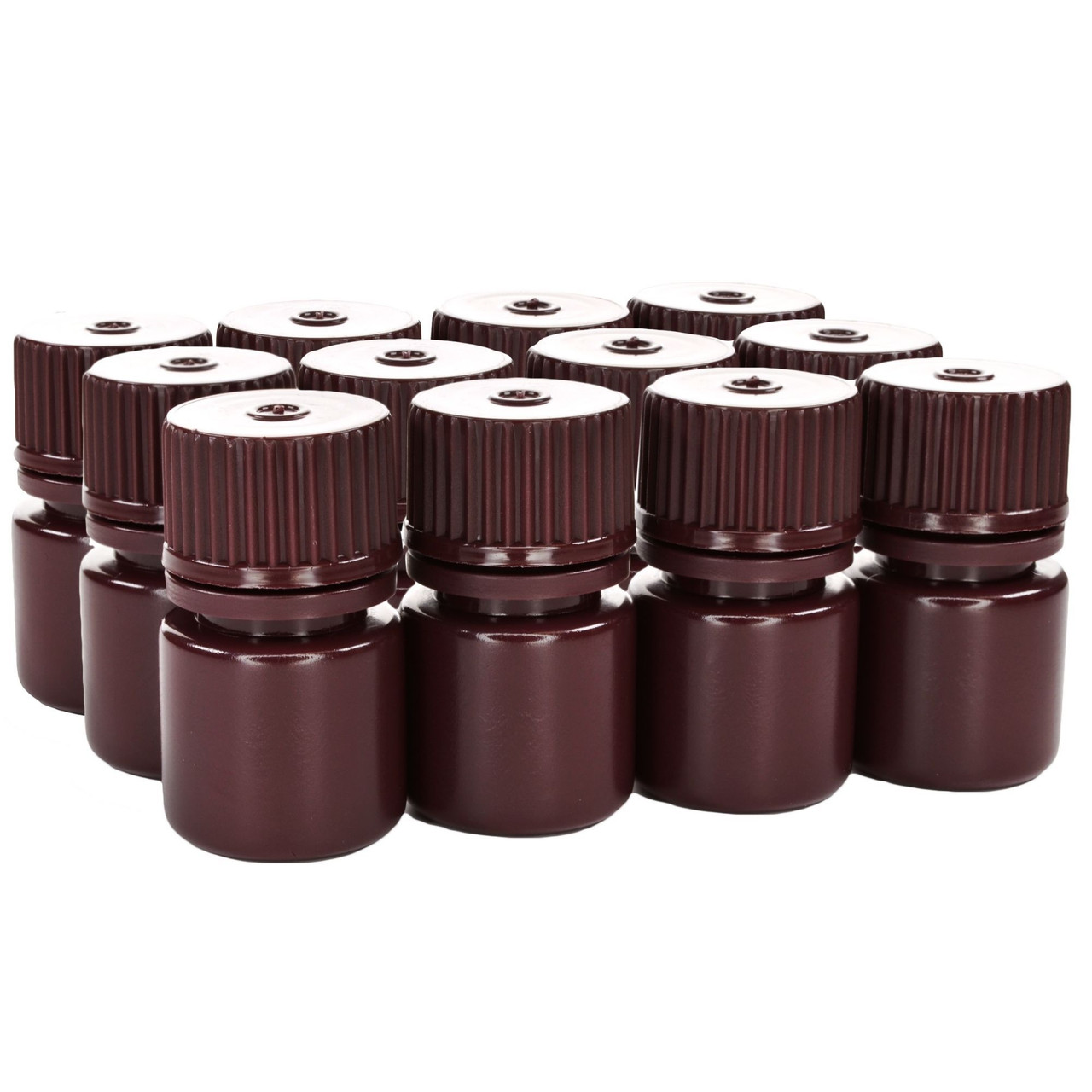 Pack of 12 8mL narrow-mouth amber HDPE reagent bottles with polypropylene caps. Sterile and engineered for light-sensitive samples, these bottles are leak-proof tested and chemical-resistant, ideal for lab use.