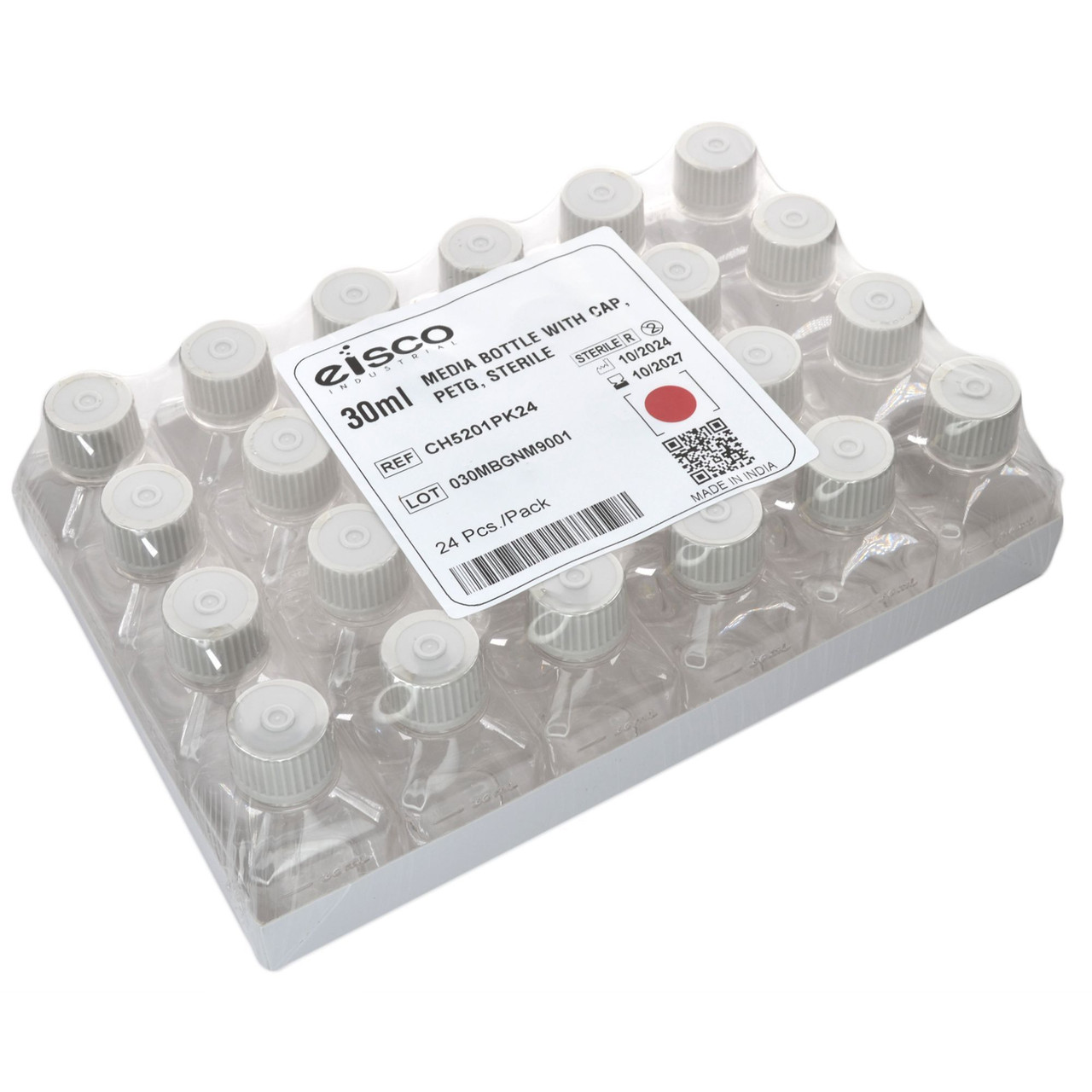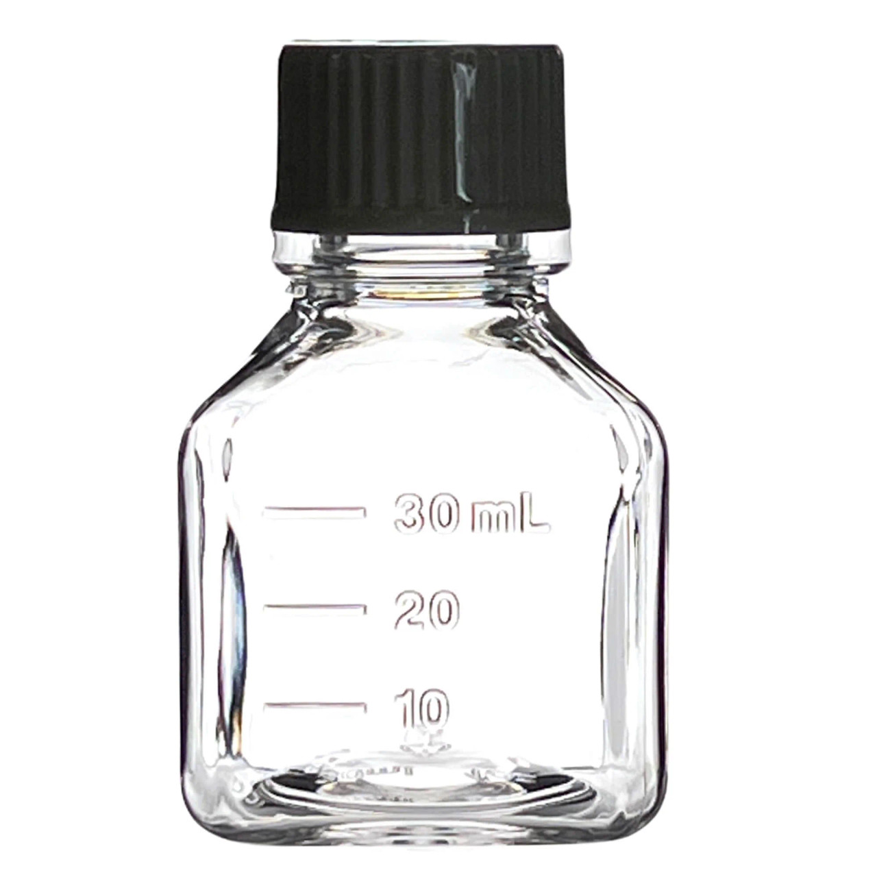 - STERILE MEDIA BOTTLES || Includes 24 sterile 30mL PETG media bottles with secure HDPE caps. Ideal for storing lab reagents, buffers, and media in scientific or biopharmaceutical environments.