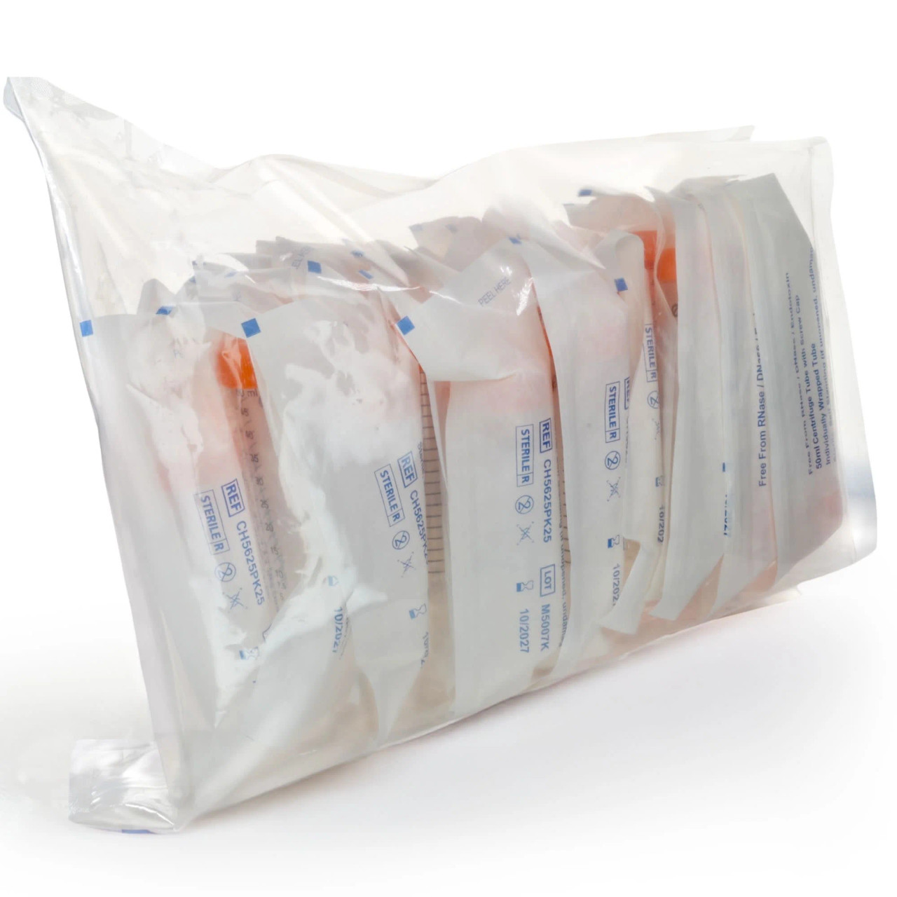 - 50ML STERILE CENTRIFUGE TUBES || Pack of 25 polypropylene tubes with flat caps, individually wrapped for secure storage.