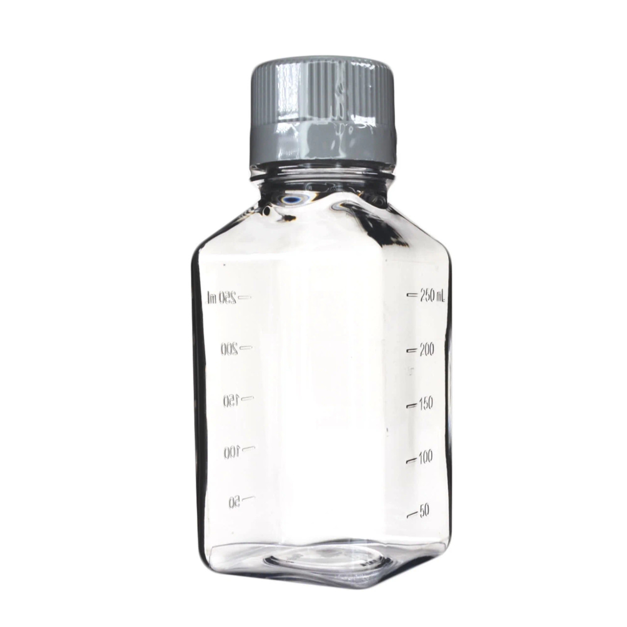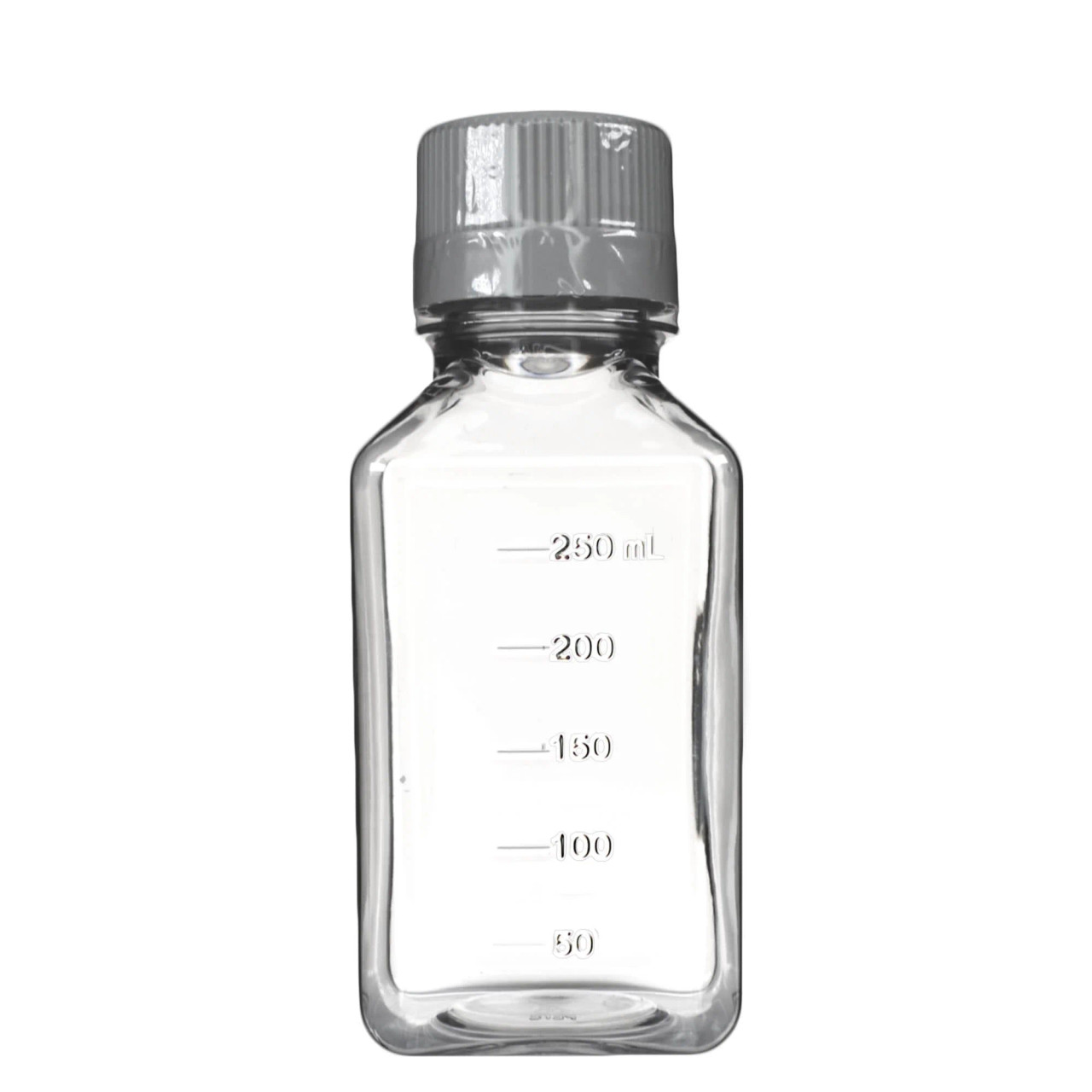 Sterile 250mL PET media bottles with HDPE caps. Pack of 30. Leakproof and tamper-evident design for secure lab reagent and buffer storage. Lightweight and durable.