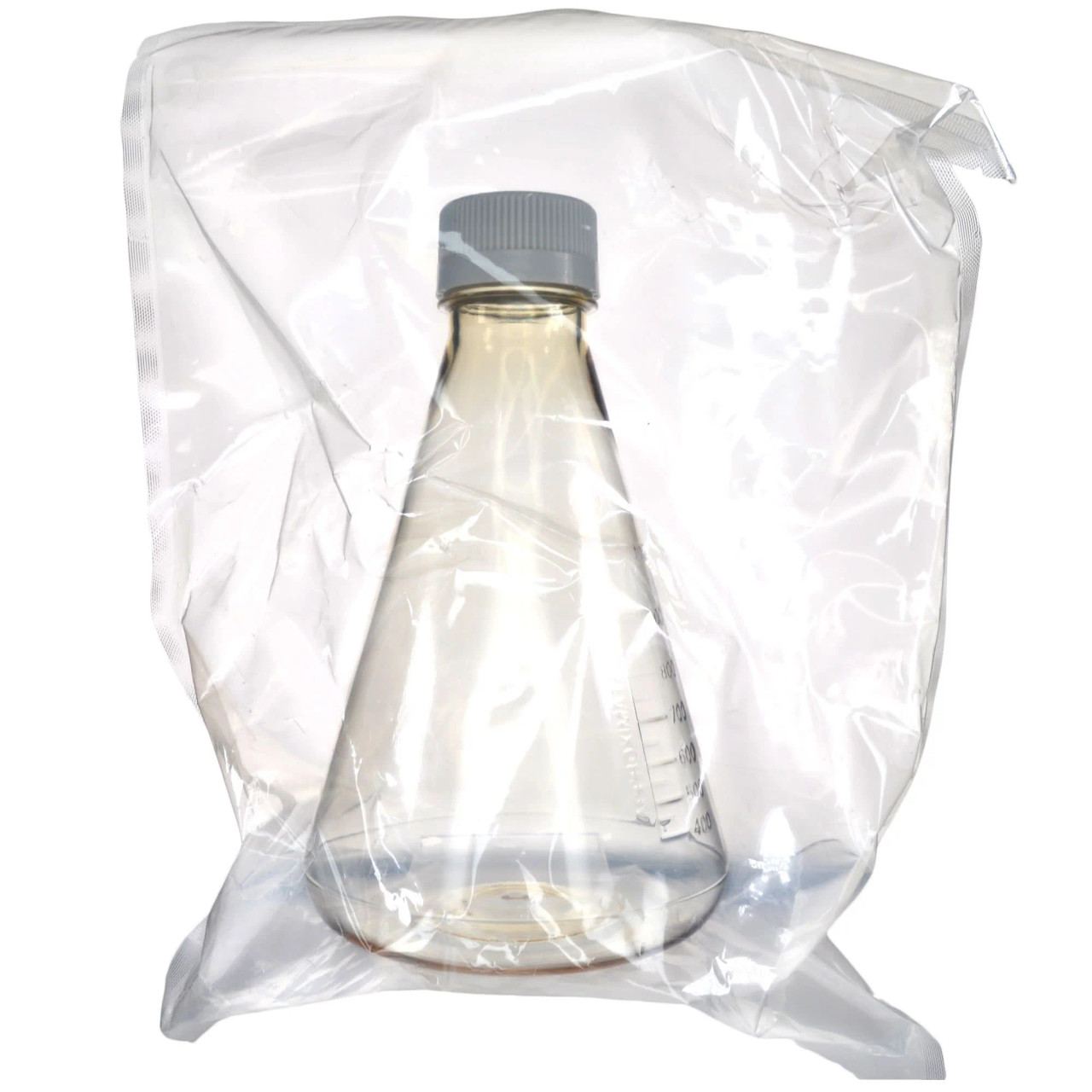 1L sterile polycarbonate Erlenmeyer flasks with non-vented caps, pack of 6. Flat bottom for stability, impact-resistant design, and gamma sterilized for lab applications. Ideal for cell culture, media prep, and chemical storage.