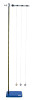 Heavy metal stand with a meter scale mounted on a vertical rod can hold three pendulums of 5 cm apart with points for suspension of cords.