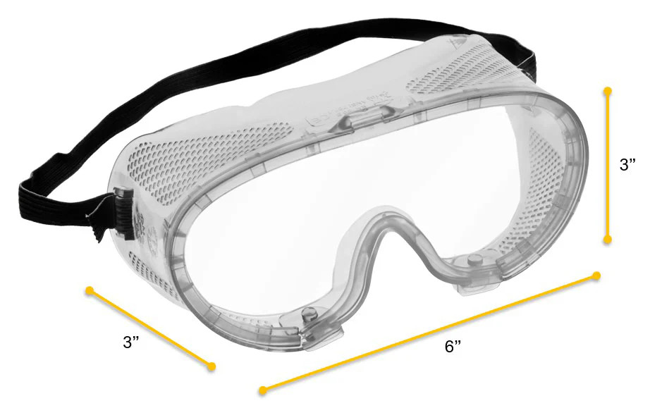 Industrial quality safety goggles. Single pair. Designed to protect your eyes from chemical splashes, high speed particles, dust and UV wavelengths (360-380). Lightweight, durable polycarbonate lens. The soft, flexible vinyl frame and pliable nose bridge provides a comfortable fit. Designed to be able to fit over prescription eyeglasses. Goggles feature a freely adjustable, soft elastic head strap. Designed for use in professional laboratories but is ideal for science classrooms and household use.
