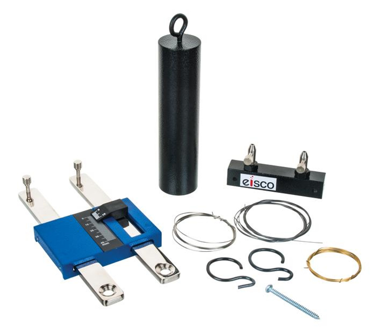 - Includes a scale plate with a 0-30mm scale, movable vernier (readable to 0.1mm), clamp for fitting, tension weigh (1.3kg mass), comparison wires, and necessary hooks and screws.