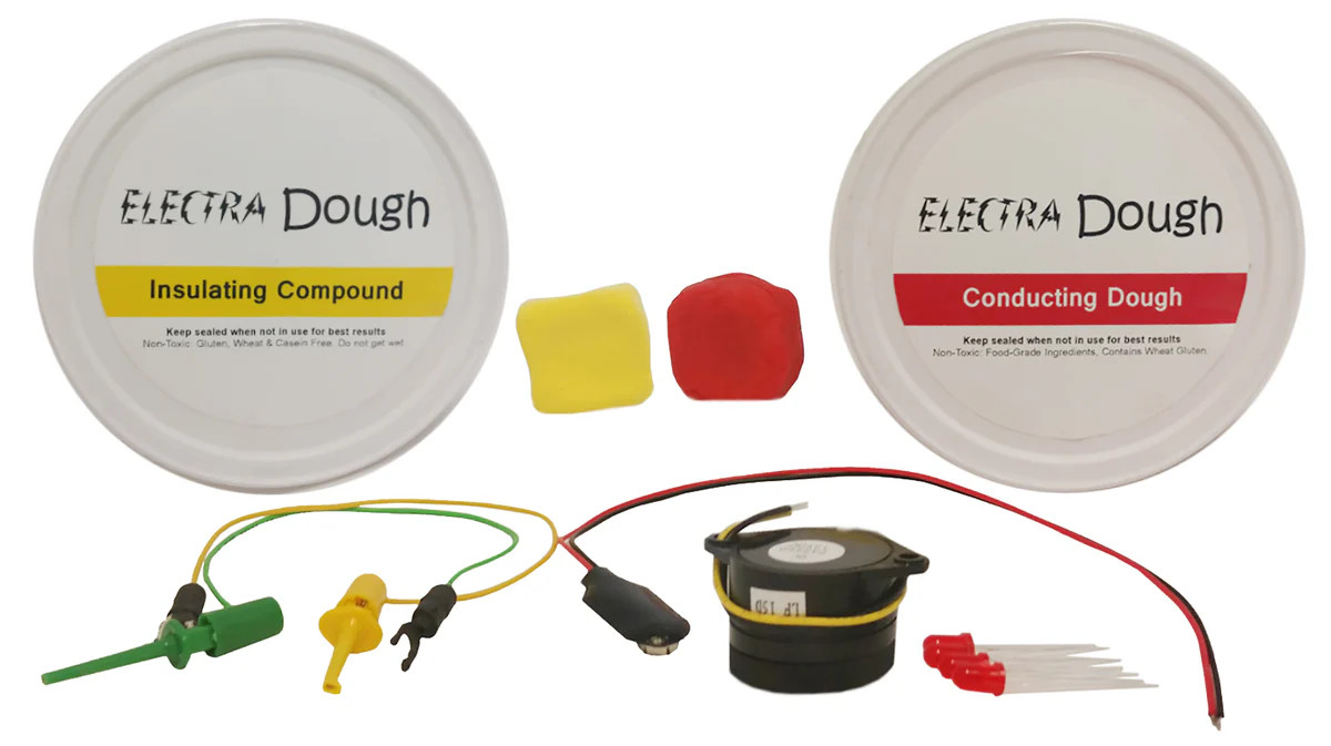 Electra dough allows students to play with materials that are fun, non-threatening, and familiar, all while learning the basic concepts of electrical circuits. This insulating dough, as the name implies, can insulate any circuit you form with the conducting dough to ensure that the electricity in your circuit only flows where you want it to. Our dough is natural, mold-proof, non-toxic, and it conforms for ASTM D4236.