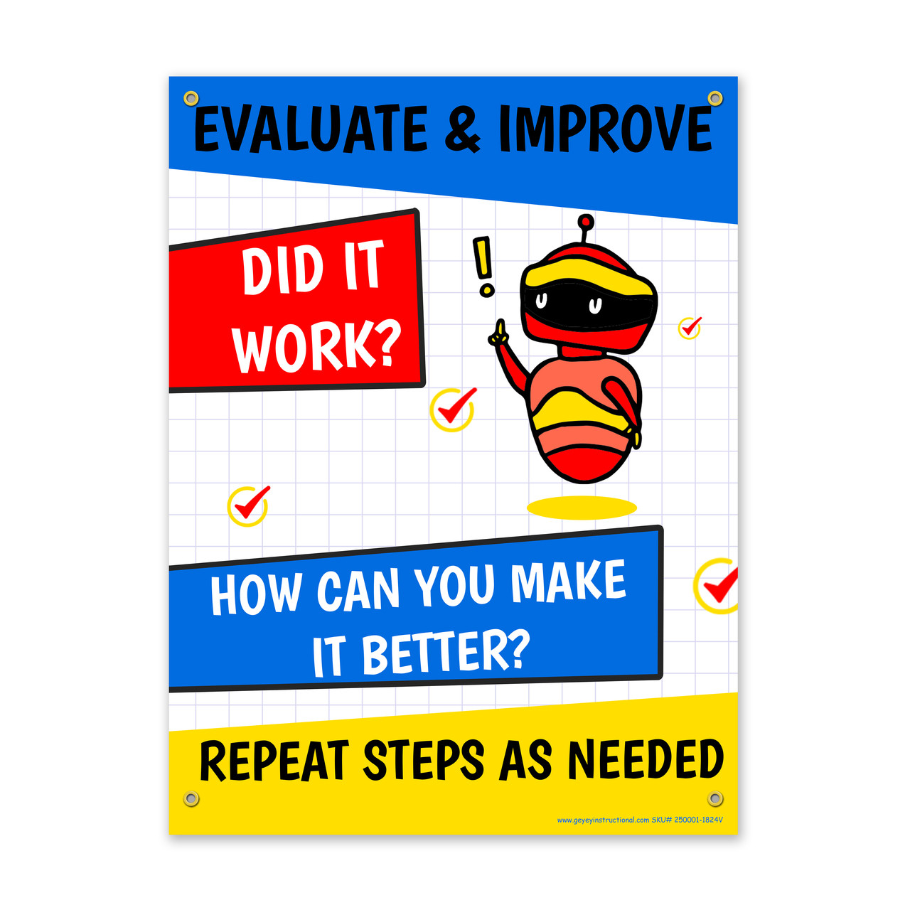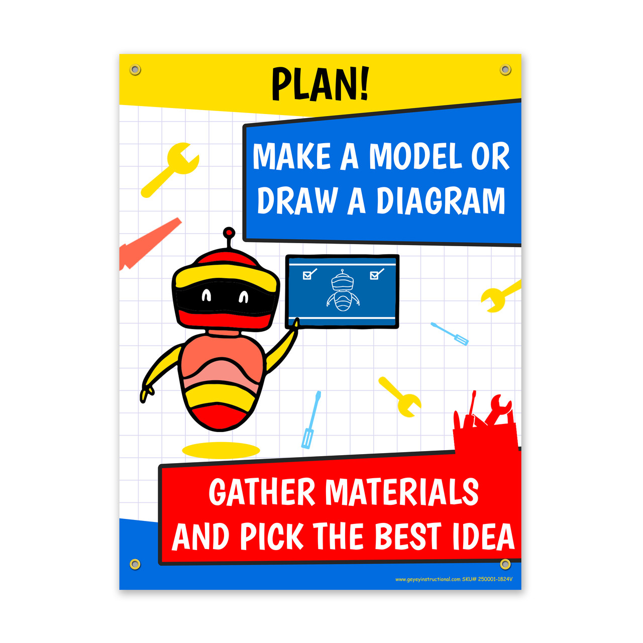 Built to last and designed to educate, the Engineering Process Vinyl Poster Set brings the steps of the engineering design process to life. Each of the six 18"x24" posters is printed on 13 oz heavy-duty vinyl, making them waterproof, tear-resistant, and suitable for both indoor and outdoor use. Pre-installed metal grommets in each corner make hanging simple and secure.