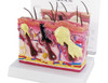 Enlarged two-sided skin cross-section. This acne model displays three conditions: whitehead, blackhead and pustule/cyst. The reverse side illustrates normal skin anatomy.