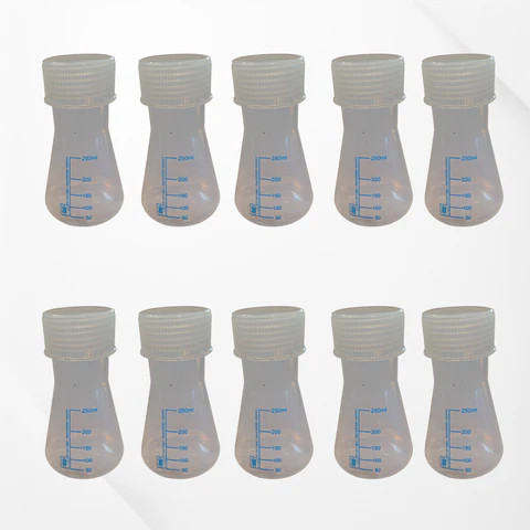 Erlenmeyer PP 250ml with screw cap and graduations up to 250ml x 50ml. Pack 10.