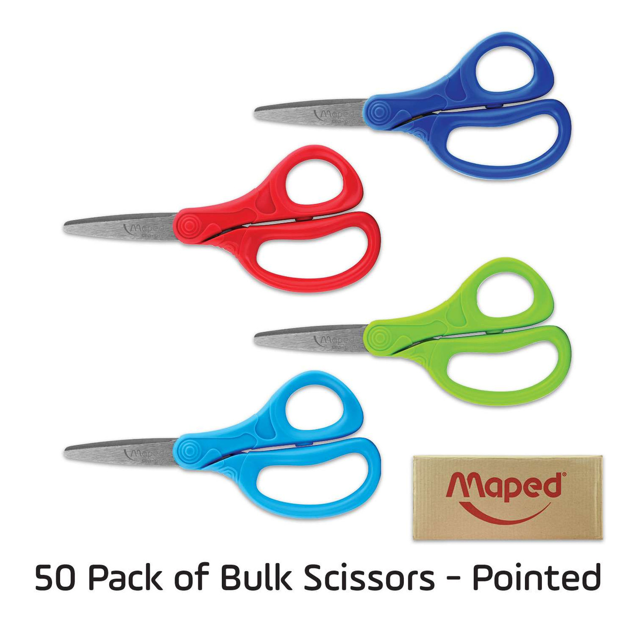 Maped Essentials Kids School Scissors are perfect for young students going back to school! Modern 5" / 13cm design features Pointed Tip Stainless Steel Blades with a rounded tip that is safer others you can find on the market and are much more appropriate for young students. Eye-catching asymmetrical handles are perfect size for young hands to hold, and are perfect for students 6+ years old. Comes in assorted colors (Blue, Light Blue, Red & Green) and cannot be chosen at this time. 50 piece bulk pack comes in assorted colors: Red, Light Blue, Blue & Green.