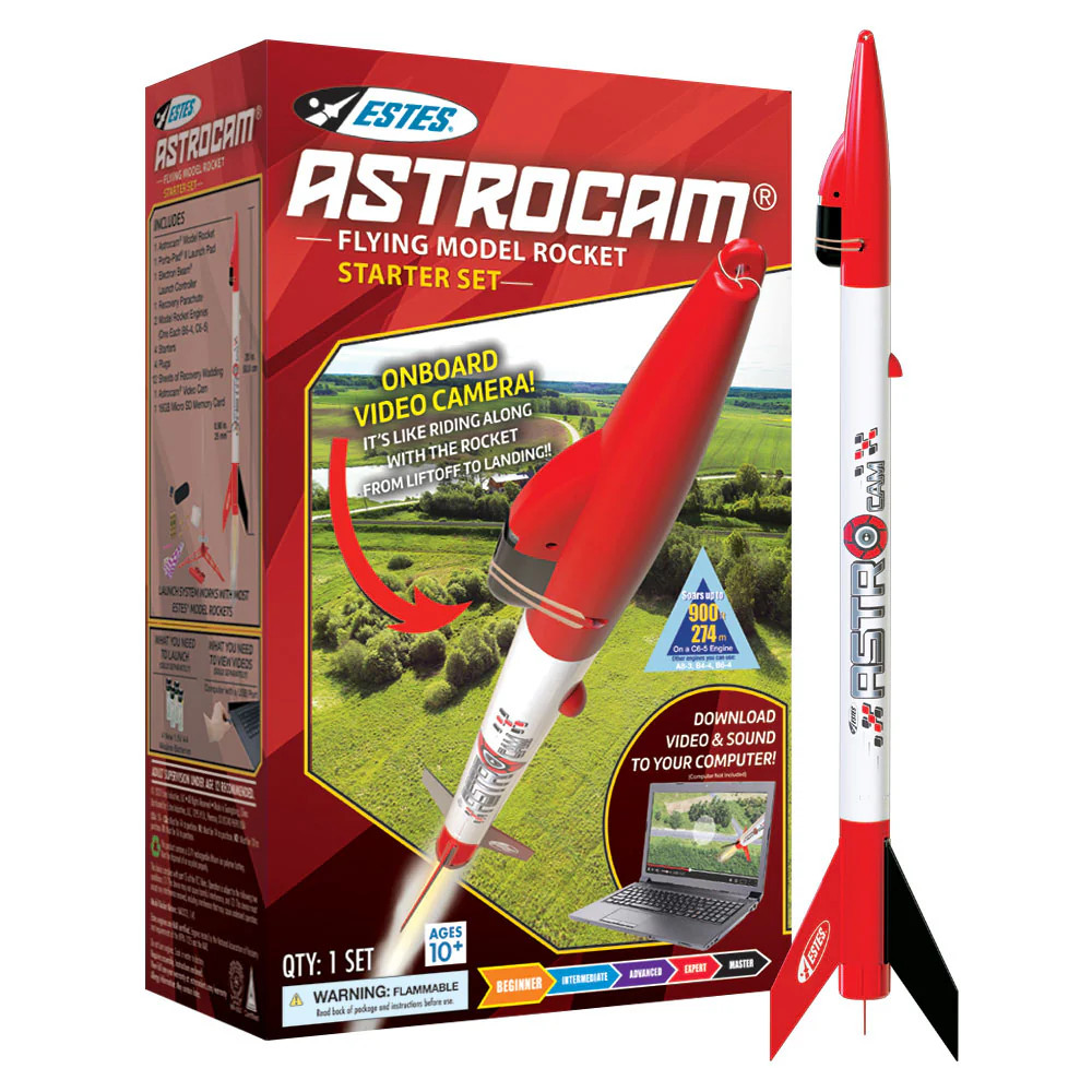 Launch and capture the view from above with the AstroCam Starter Set. This all-in-one kit includes a high-flying model rocket with a built-in video camera, plus a launch pad and controller—everything you need to fly and record your own rocket launch. It's perfect for beginners, STEM learning, and anyone who wants to relive the excitement from the rocket’s point of view.