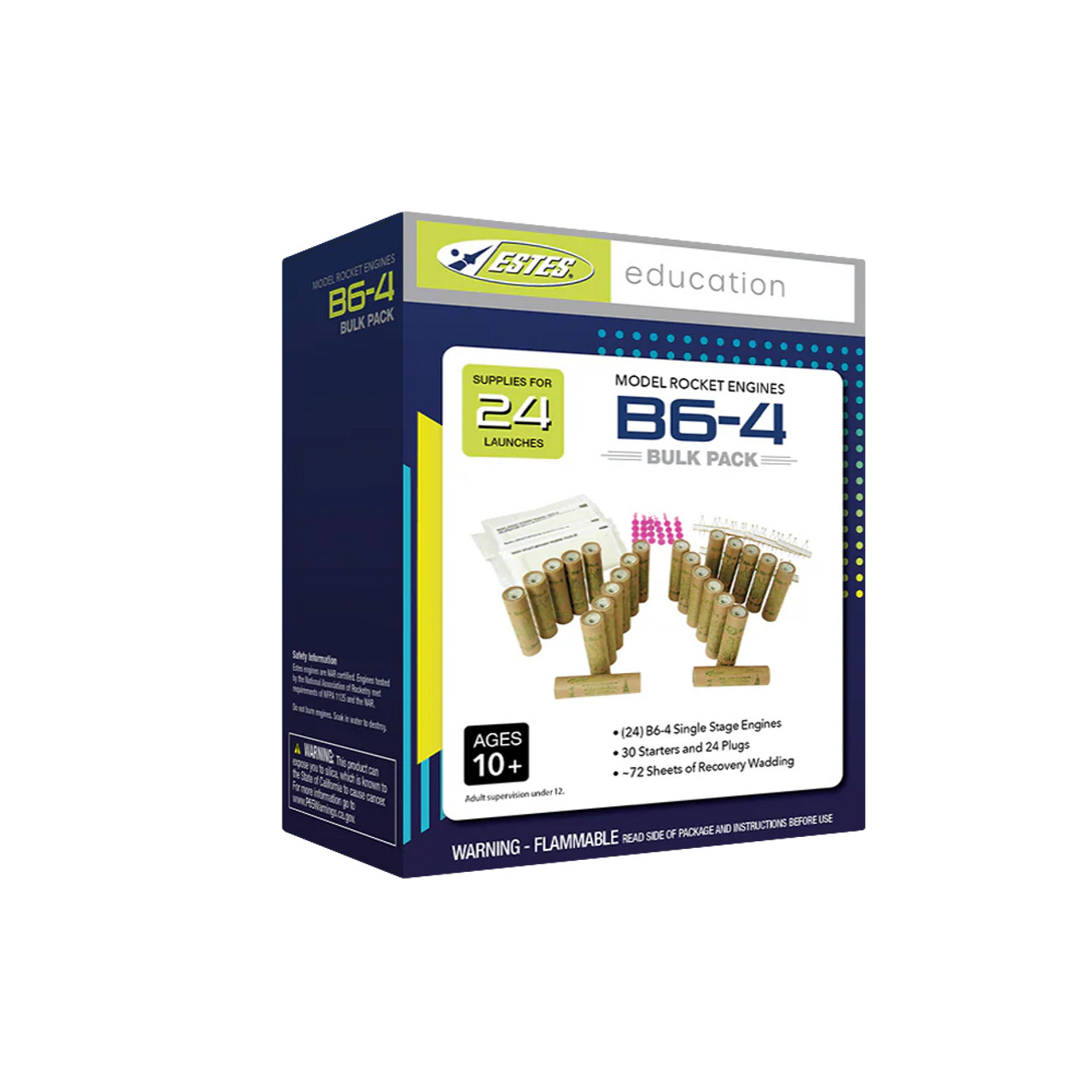 Engine bulk packs make it simple to get your fleet launch-ready, with everything you need to prep 24 rockets for takeoff. Whether for the classroom, youth groups, or backyard launches, the B6-4 is a dependable choice for rocketeers of all levels.