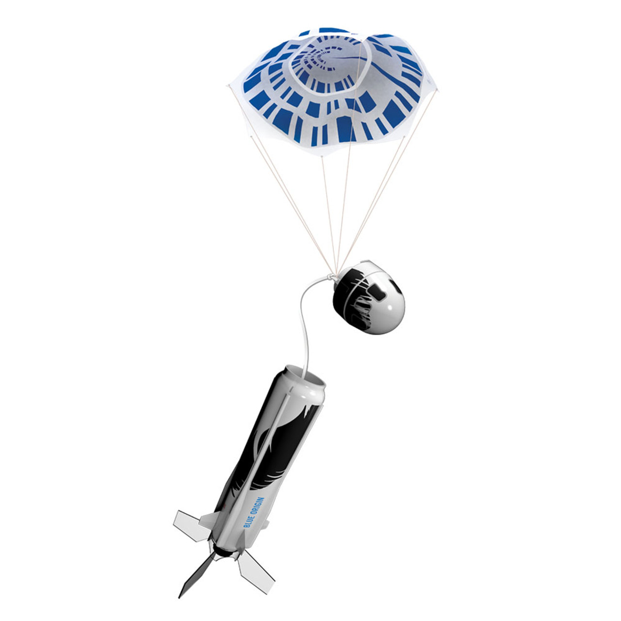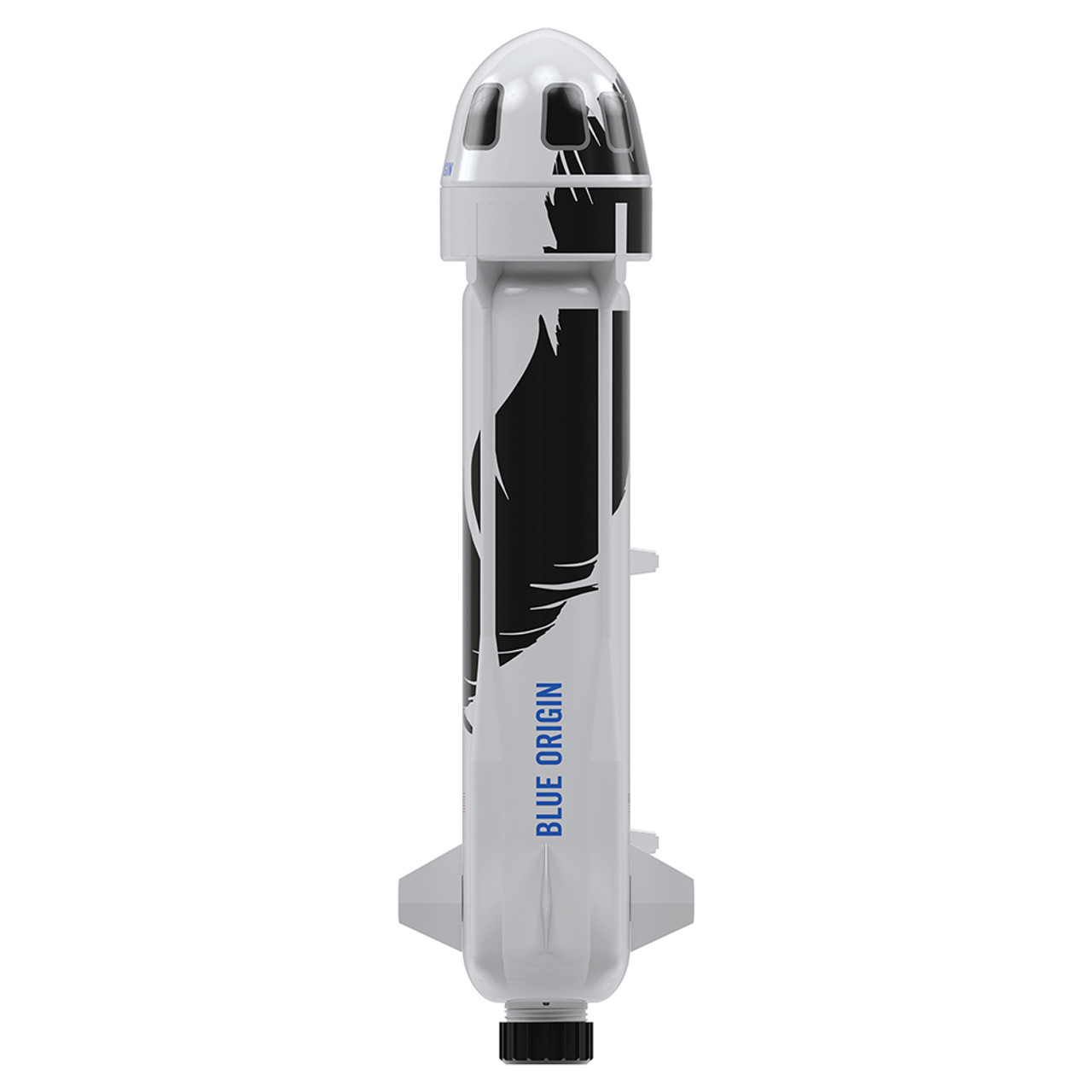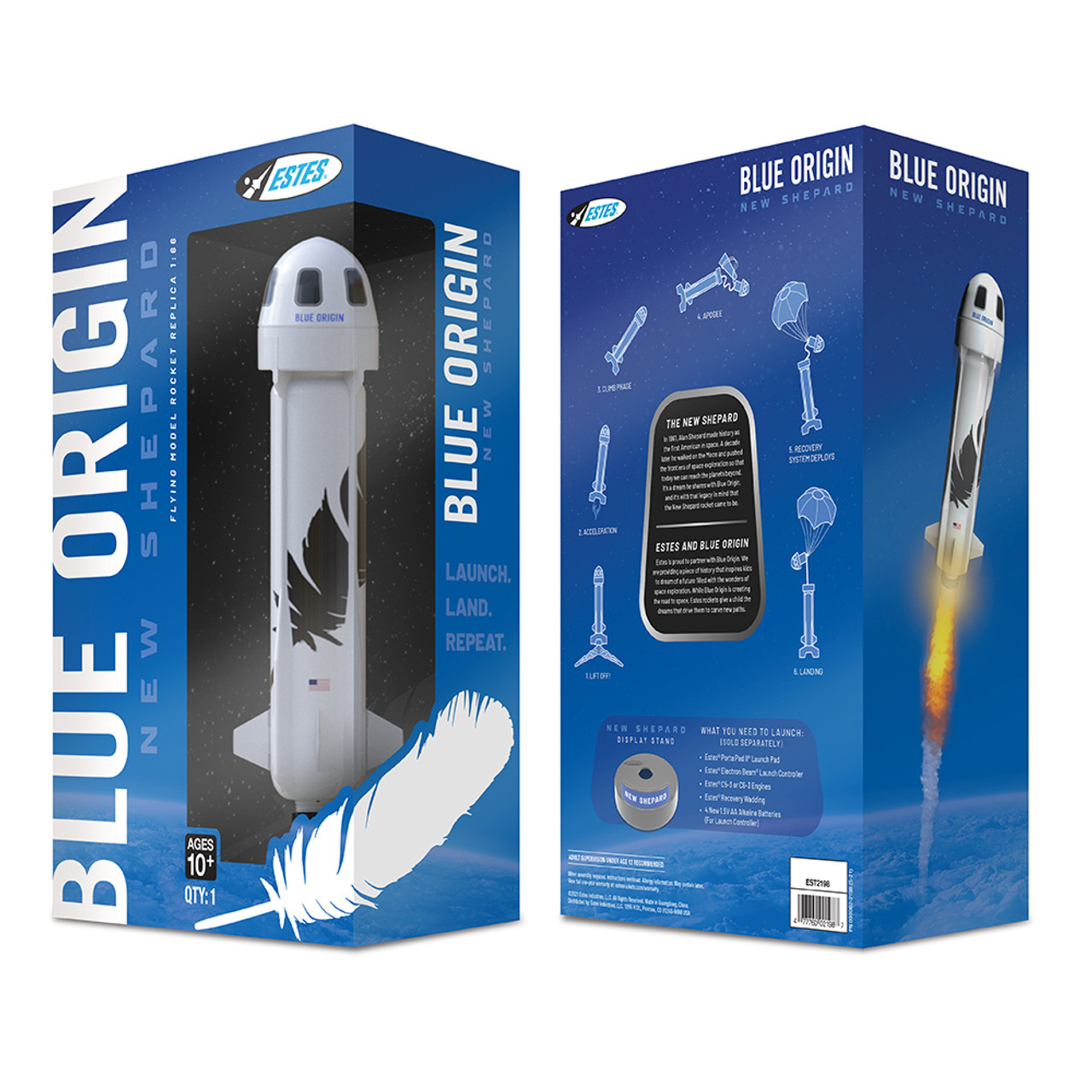 - The boosters that kick up the cloud allow the capsule to touch down extremely lightly, at a mile an hour or less. The Estes New Shepard is a 1/66th scale model of the Blue Origin New Shepard launch vehicle.
