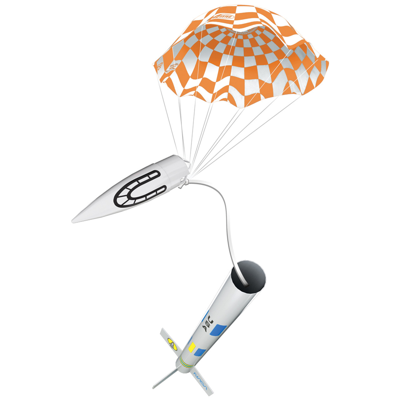 The Generic E2X is a standard engine rocket that launches with a Estes Porta-Pad II Launch Pad and Electron Beam Launch Controller. The rocket has a 12 inch parachute for its recovery system.