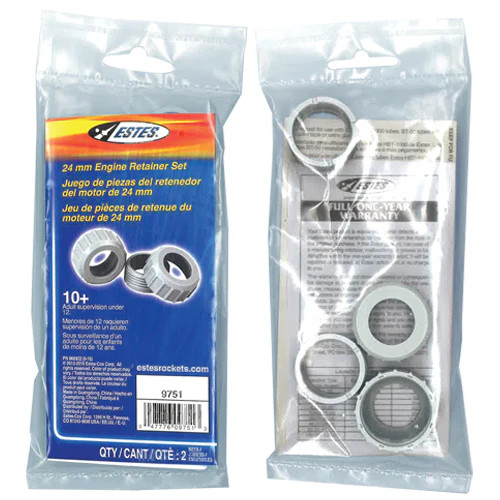 This threaded Motor Retainer Set is molded in a heat resistant ABS plastic which allows you to quickly and easily load and unload all Estes 24 mm C11, D12 and E12 motors.