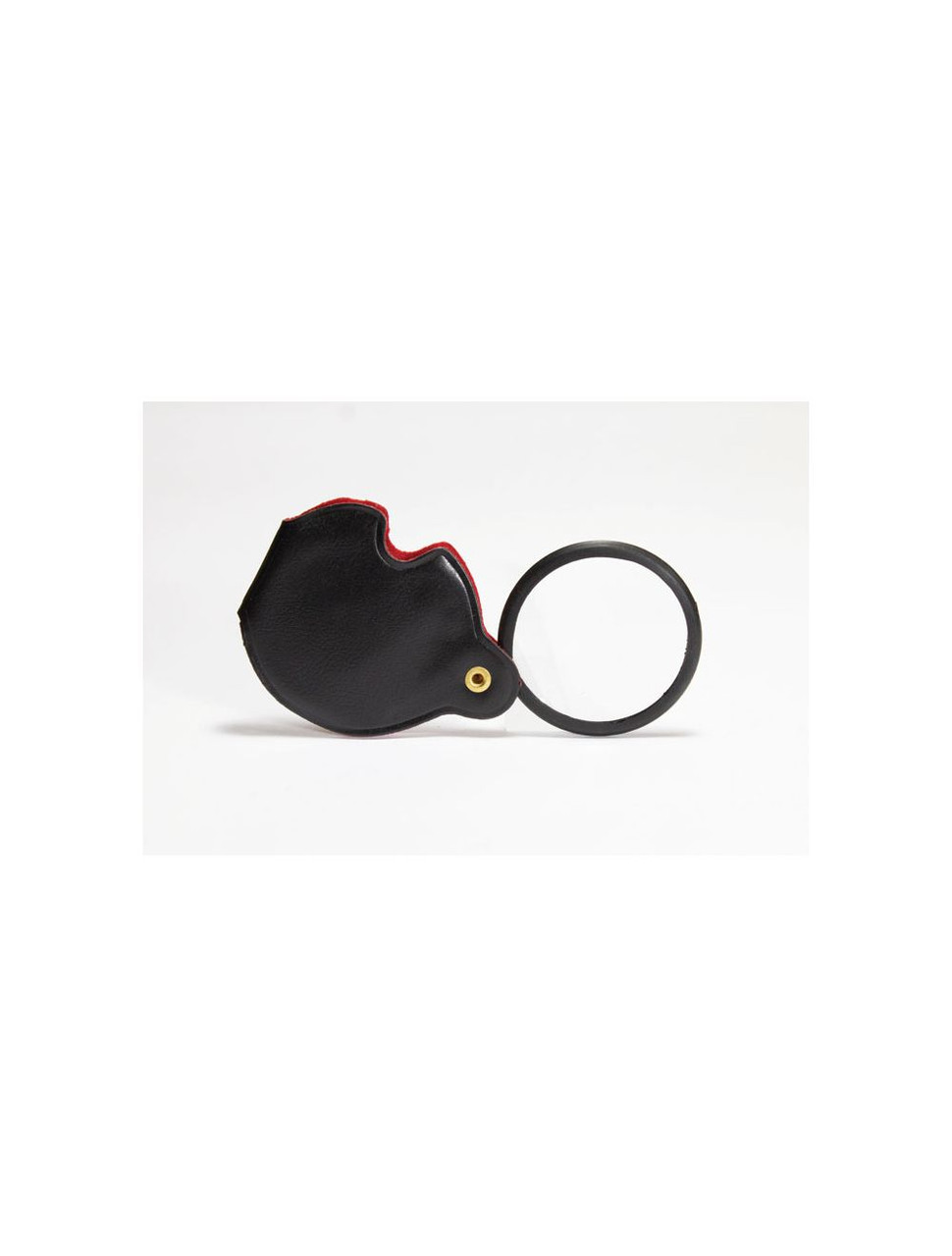 Folding magnifier in a carrying pouch. Measures 50mm in diameter, with 2.5x magnification.