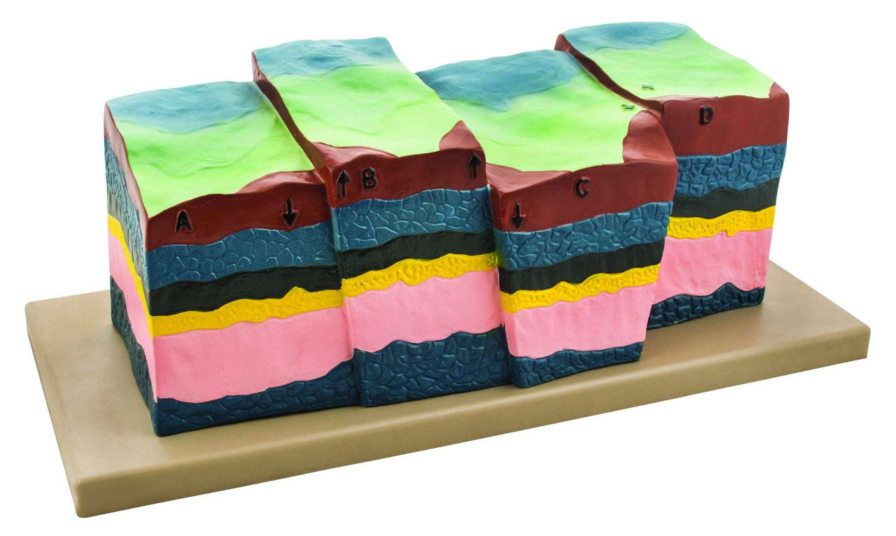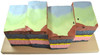 This colored model is made to last a durable polymer. Shows how rock layers react under stress, breaking and sliding past one another. Shows normal, reverse, and strike-slip faults. Differentiate the hanging wall from the footwall.