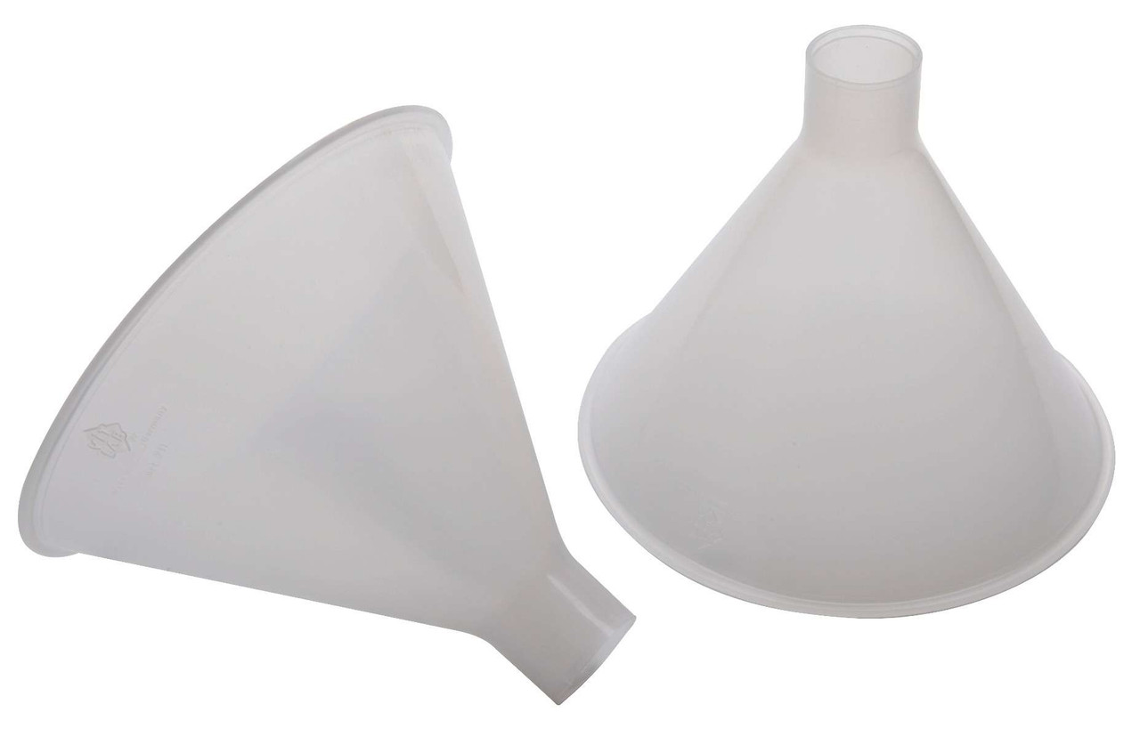 - Wide stem, autoclavable plastic powder funnels
