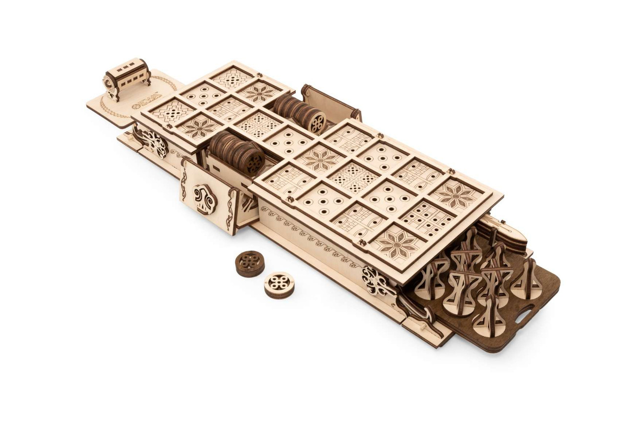This 3D puzzle to assemble includes 3 classic games: Chess, Checkers, and the mathematician game called "Battle" (Rules included). Both sides of the box offer different playing fields. All playing pieces are included and can be stored inside the box, making it a perfect travel set.