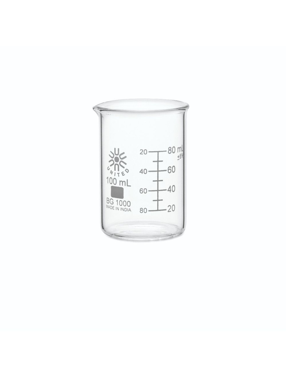 Set of five borosilicate glass beakers: one each of 50ml, 100ml, 250ml, 600ml and 1000ml capacities. Beakers feature a pour spout, a double graduated metric scale and a marking area.